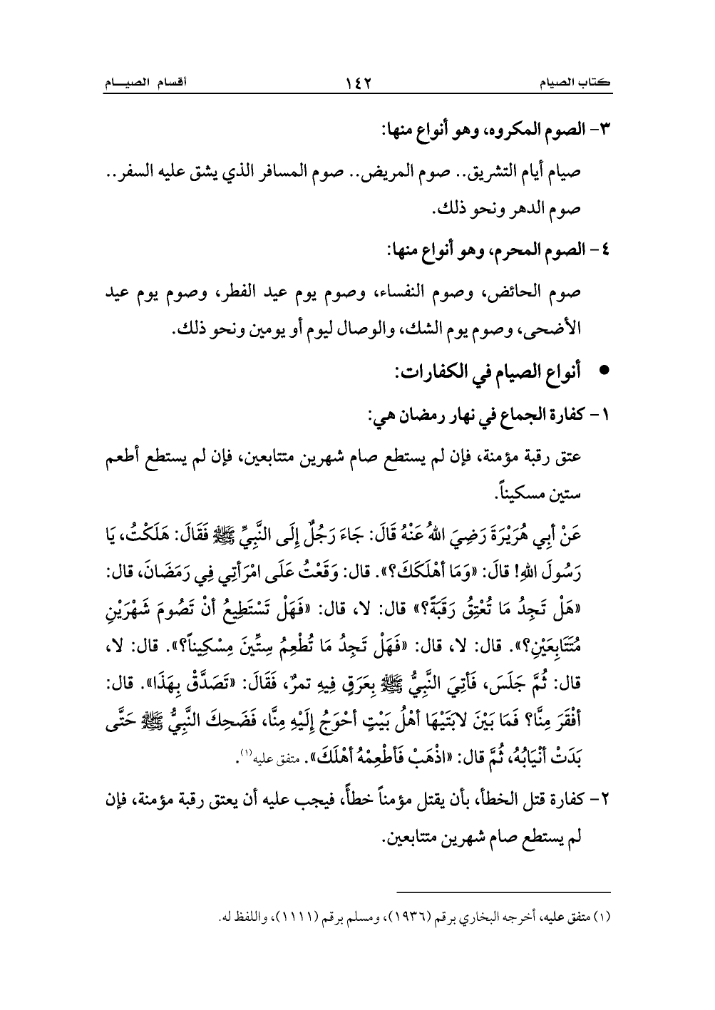 عَنْ أبِي هُرَيْرَةَ رَضِيَ اللهُ عَنْهُ قَالَ: جَاءَ رَجُلٌ إِلَى النَّبِيِّ - صلى الله عليه وسلم - فَقَالَ: هَلَكْتُ، يَا رَسُولَ اللهِ! قالَ: «وَمَا أهْلَكَكَ؟». قال: وَقَعْتُ عَلَى امْرَأتِي فِي رَمَضَانَ، قال: «هَلْ تَجِدُ مَا تُعْتِقُ رَقَبَةً؟» قال: لا، قال: «فَهَلْ تَسْتَطِيعُ أنْ تَصُومَ شَهْرَيْنِ مُتَتَابِعَيْنِ؟». قال: لا، قال: «فَهَلْ تَجِدُ مَا تُطْعِمُ سِتِّينَ مِسْكِيناً؟». قال: لا، قال: ثُمَّ جَلَسَ، فَأتِيَ النَّبِيُّ - صلى الله عليه وسلم - بِعَرَقٍ فِيهِ تمرٌ، فَقَالَ: «تَصَدَّقْ بِهَذَا». قال: أفْقَرَ مِنَّا؟ فَمَا بَيْنَ لابَتَيْهَا أهْلُ بَيْتٍ أحْوَجُ إِلَيْهِ مِنَّا، فَضَحِكَ النَّبِيُّ - صلى الله عليه وسلم - حَتَّى بَدَتْ أنْيَابُهُ، ثُمَّ قال: «اذْهَبْ فَأطْعِمْهُ أهْلَكَ». متفق عليه (¬1).