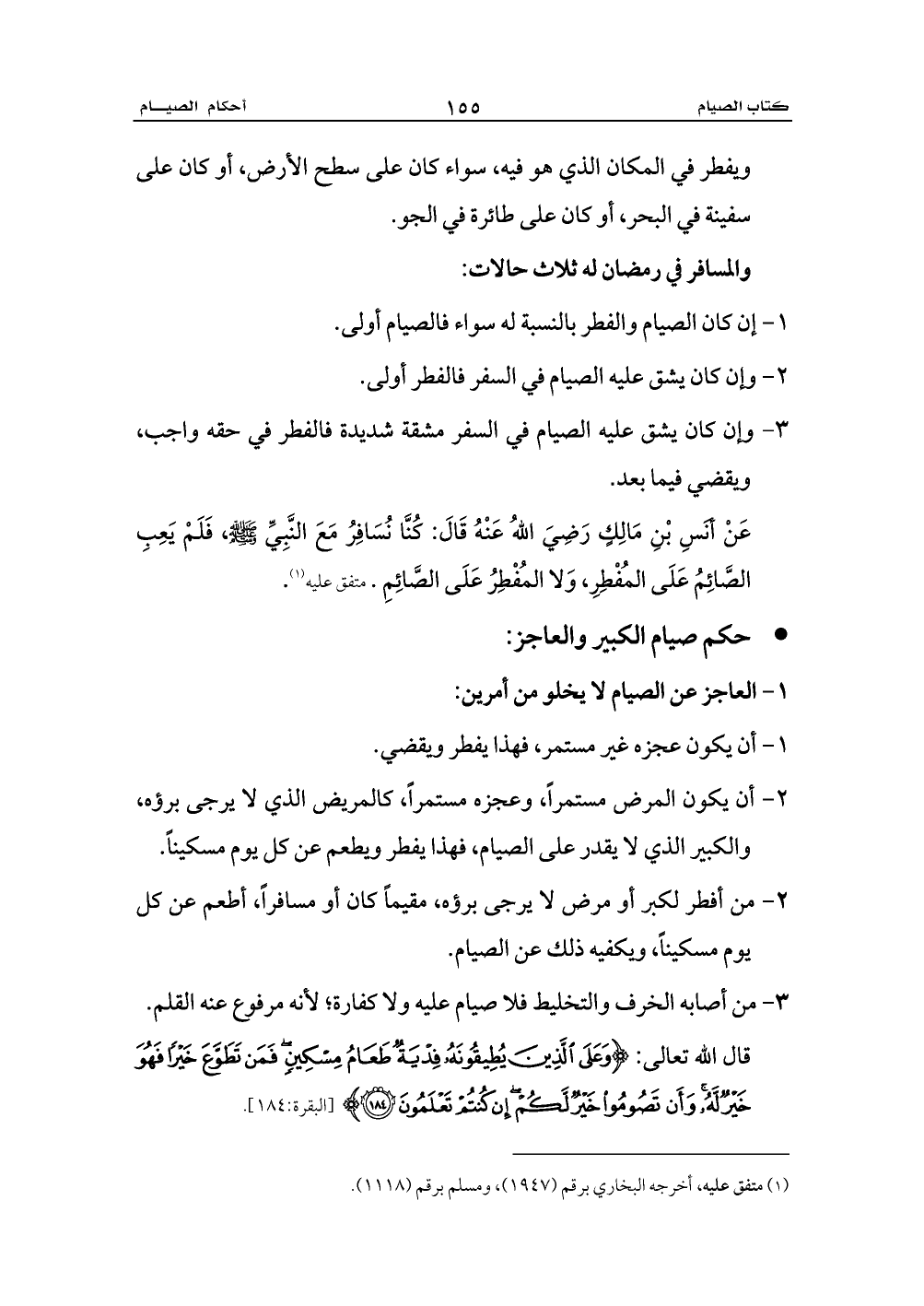 2 - من أفطر لكبر أو مرض لا يرجى برؤه، مقيماً كان أو مسافراً، أطعم عن كل يوم مسكيناً، ويكفيه ذلك عن الصيام.