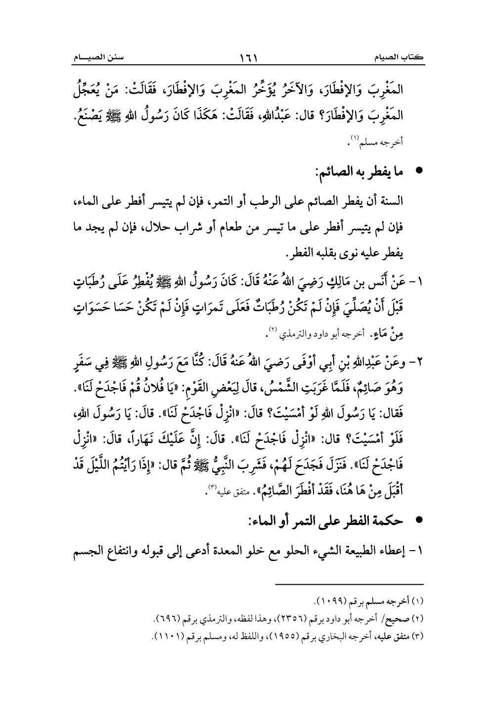 1 - عَنْ أَنَس بن مَالِكٍ رَضِيَ اللهُ عَنْهُ قَالَ: كَانَ رَسُولُ اللهِ - صلى الله عليه وسلم - يُفْطِرُ عَلَى رُطَبَاتٍ قَبْلَ أَنْ يُصَلِّيَ فَإِنْ لَمْ تَكُنْ رُطَبَاتٌ فَعَلَى تَمرَاتٍ فَإِنْ لَمْ تَكُنْ حَسَا حَسَوَاتٍ مِنْ مَاءٍ. أخرجه أبو داود والترمذي (¬2).