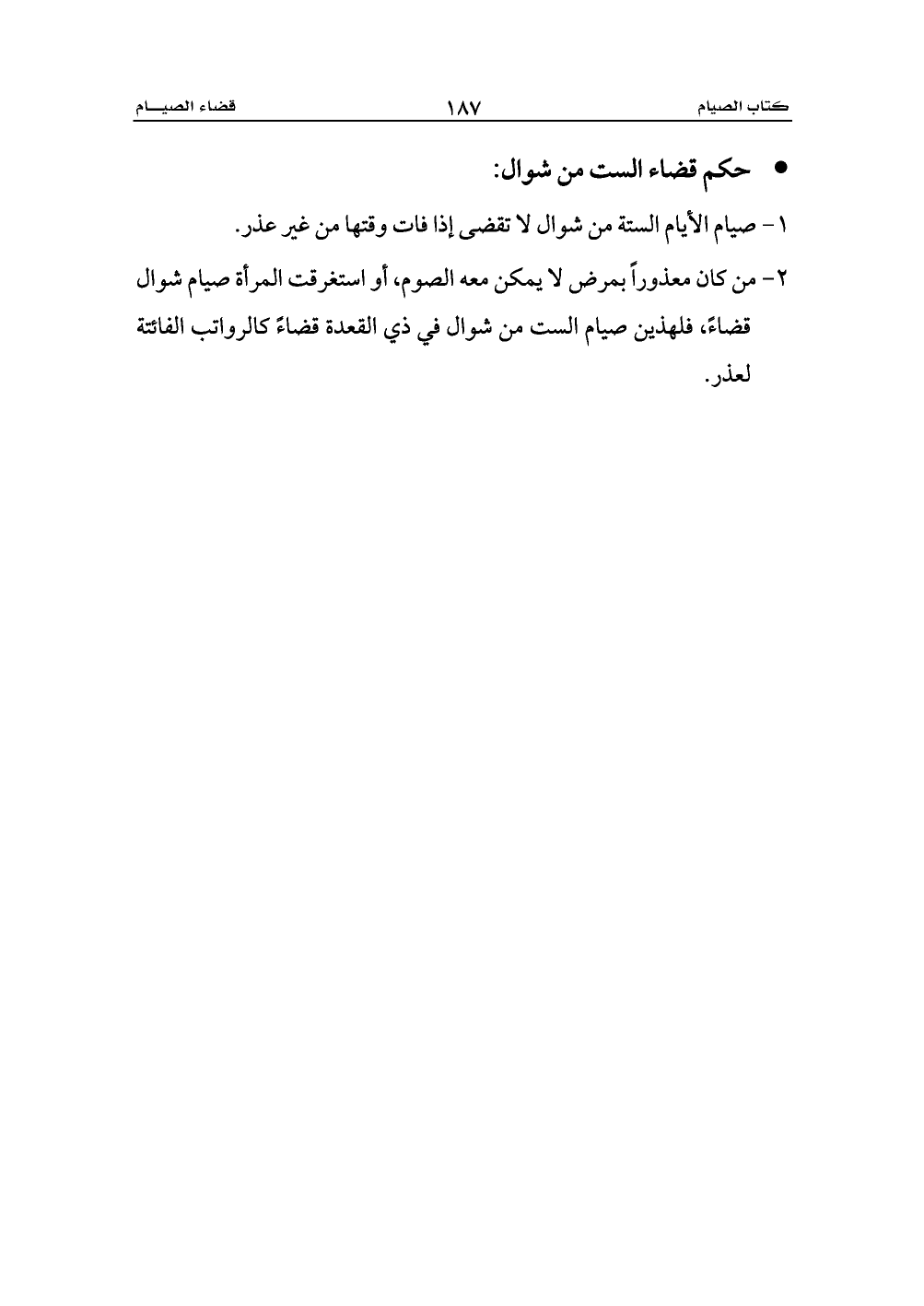1 - صيام الأيام الستة من شوال لا تقضى إذا فات وقتها من غير عذر.