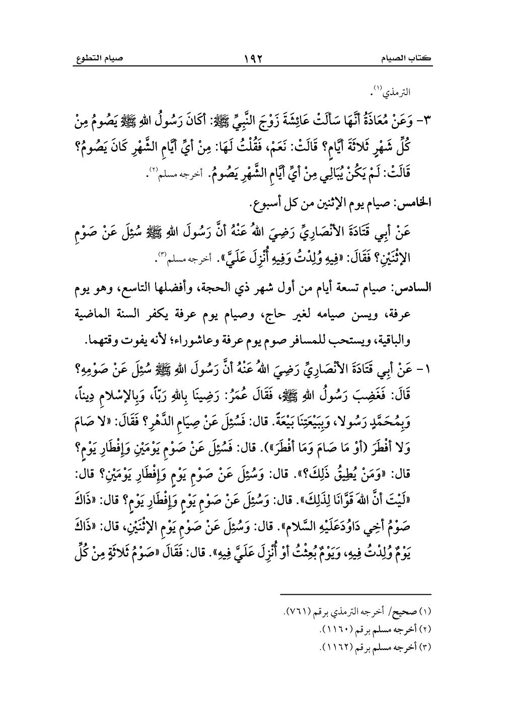 3 - وَعَنْ مُعَاذَةُ أنَّهَا سَألَتْ عَائِشَةَ زَوْجَ النَّبِيِّ - صلى الله عليه وسلم -: أكَانَ رَسُولُ اللهِ - صلى الله عليه وسلم - يَصُومُ مِنْ كُلِّ شَهْرٍ ثَلاثَةَ أيَّامٍ؟ قَالَتْ: نَعَمْ، فَقُلْتُ لَهَا: مِنْ أيِّ أيَّامِ الشَّهْرِ كَانَ يَصُومُ؟ قَالَتْ: لَمْ يَكُنْ يُبَالِي مِنْ أيِّ أيَّامِ الشَّهْرِ يَصُومُ. أخرجه مسلم (¬2).