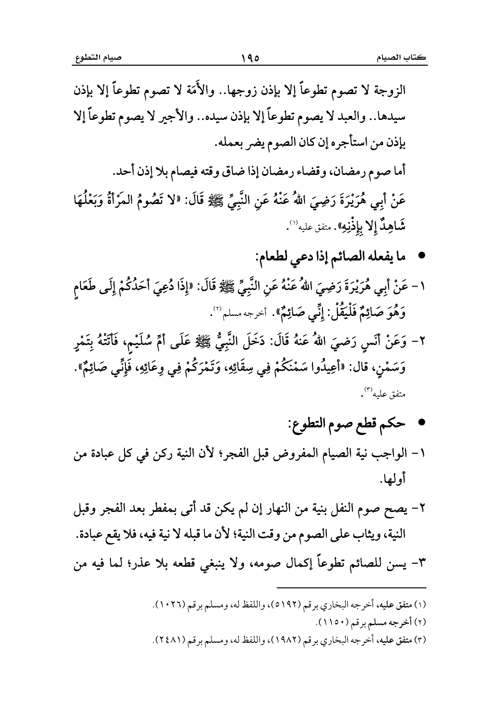 الزوجة لا تصوم تطوعاً إلا بإذن زوجها .. والأَمَة لا تصوم تطوعاً إلا بإذن سيدها .. والعبد لا يصوم تطوعاً إلا بإذن سيده .. والأجير لا يصوم تطوعاً إلا بإذن من استأجره إن كان الصوم يضر بعمله.
