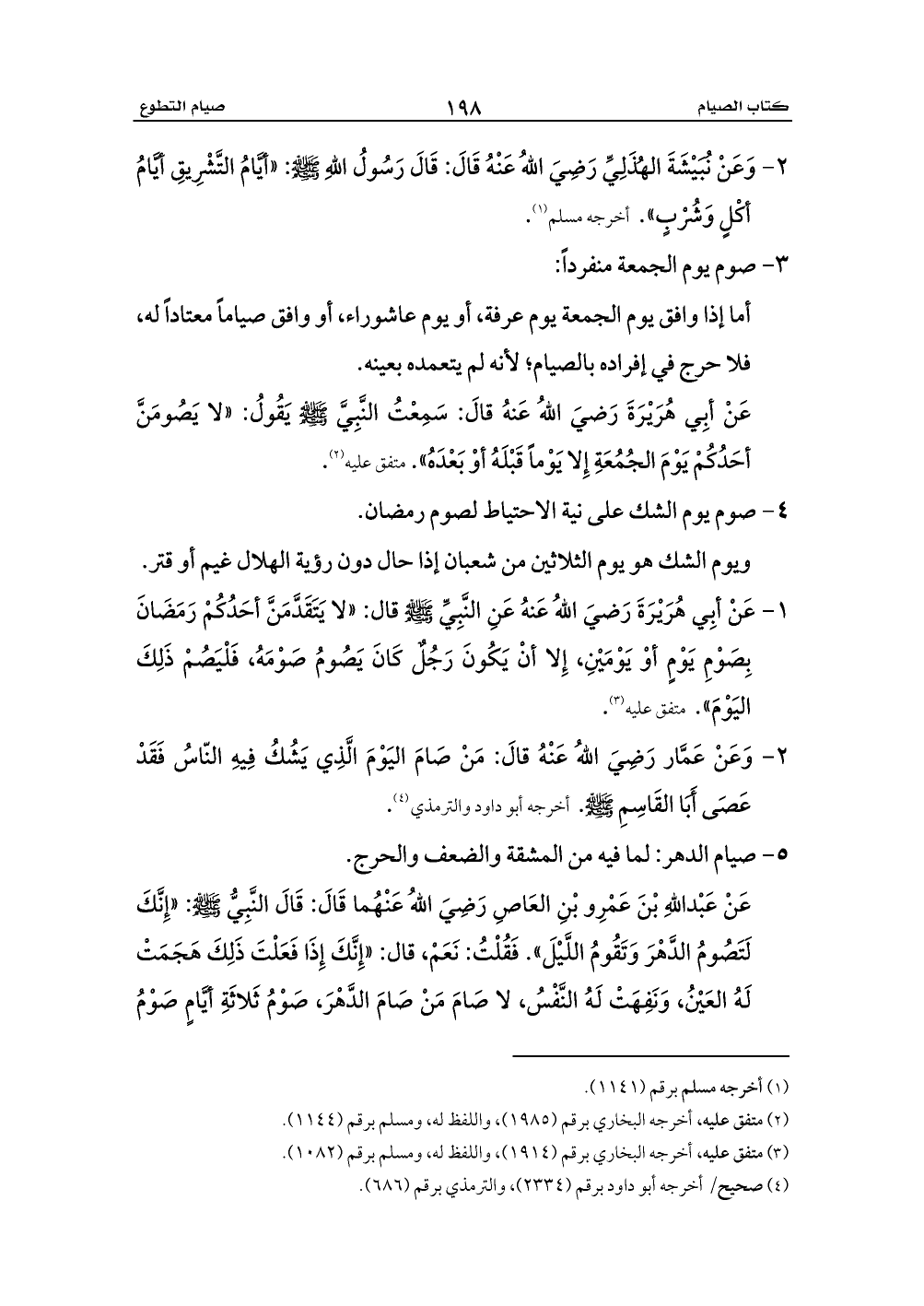 1 - عَنْ أبِي هُرَيْرَةَ رَضيَ اللهُ عَنهُ عَنِ النَّبِيِّ - صلى الله عليه وسلم - قال: «لا يَتَقَدَّمَنَّ أحَدُكُمْ رَمَضَانَ بِصَوْمِ يَوْمٍ أوْ يَوْمَيْنِ، إِلا أنْ يَكُونَ رَجُلٌ كَانَ يَصُومُ صَوْمَهُ، فَلْيَصُمْ ذَلِكَ اليَوْمَ». متفق عليه (¬3).