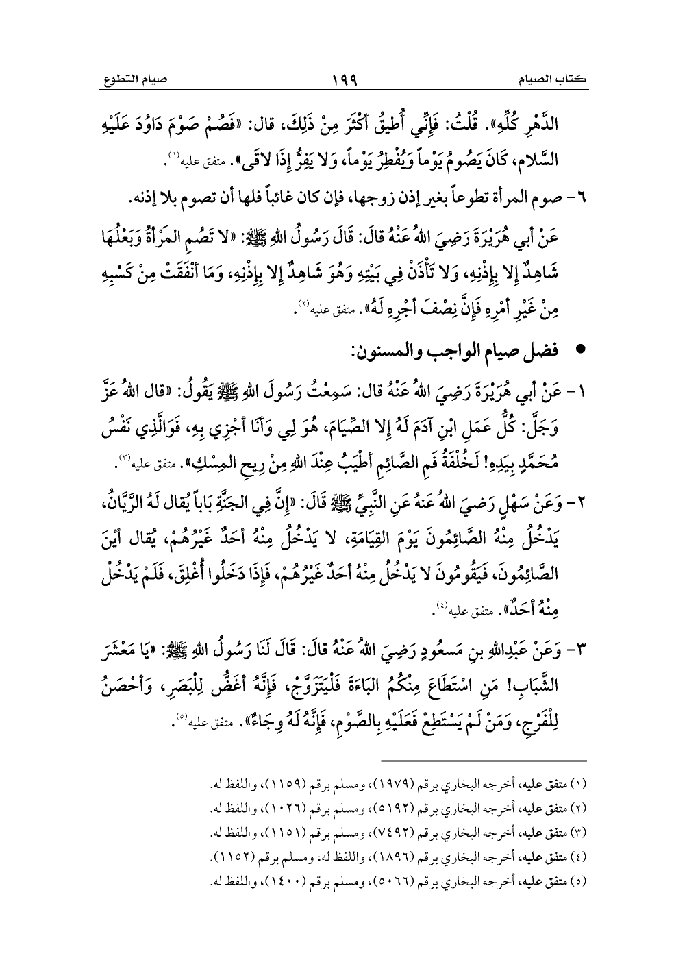 عَنْ أبي هُرَيْرَةَ رَضِيَ اللهُ عَنْهُ قالَ: قَالَ رَسُولُ اللهِ - صلى الله عليه وسلم -: «لا تَصُمِ المَرْأةُ وَبَعْلُهَا شَاهِدٌ إِلا بِإِذْنِهِ، وَلا تَأْذَنْ فِي بَيْتِهِ وَهُوَ شَاهِدٌ إِلا بِإِذْنِهِ، وَمَا أنْفَقَتْ مِنْ كَسْبِهِ مِنْ غَيْرِ أمْرِهِ فَإِنَّ نِصْفَ أجْرِهِ لَهُ». متفق عليه (¬2).