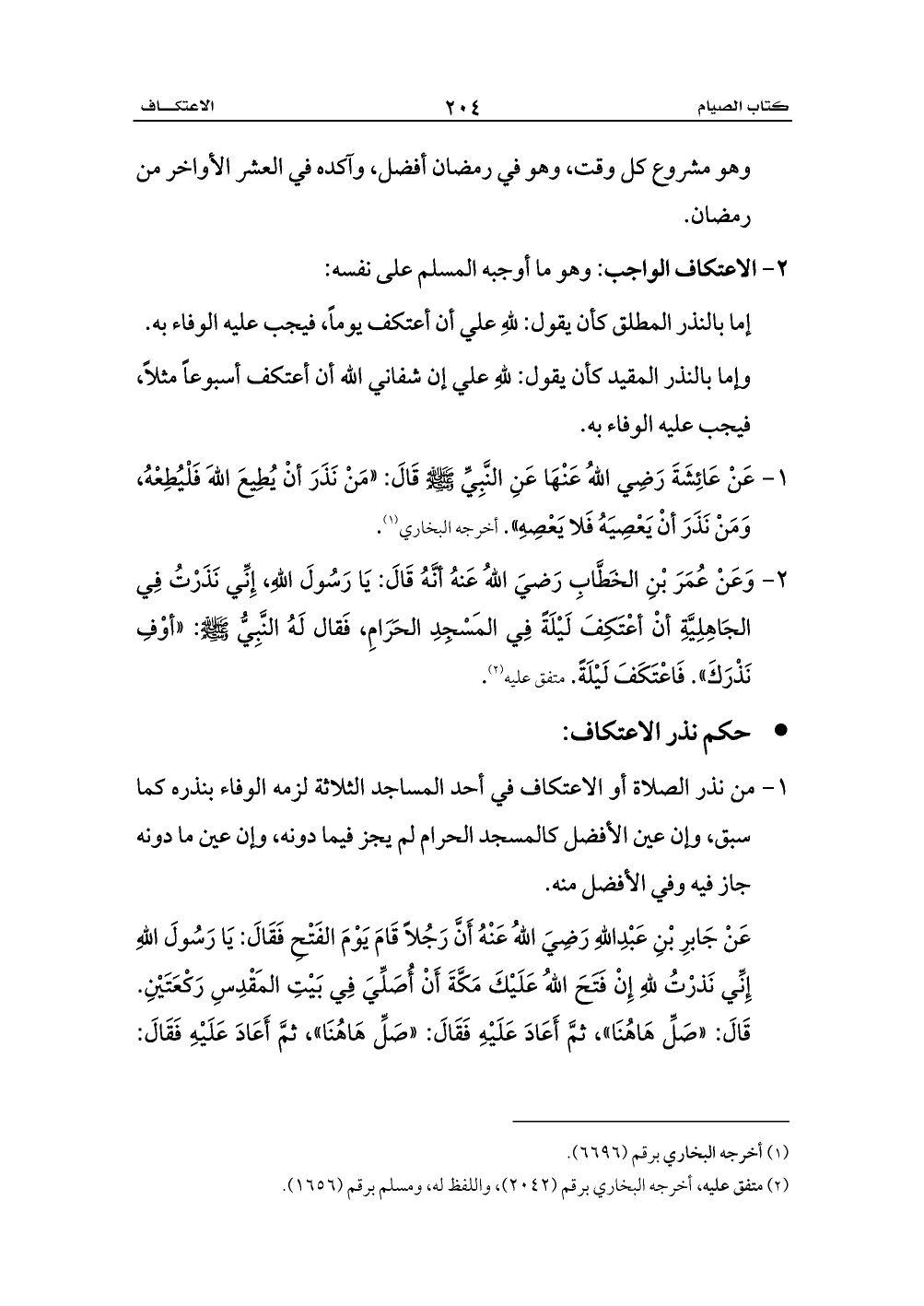 2 - وَعَنْ عُمَرَ بْنِ الخَطَّابِ رَضيَ اللهُ عَنهُ أنَّهُ قَالَ: يَا رَسُولَ اللهِ، إِنِّي نَذَرْتُ فِي الجَاهِلِيَّةِ أنْ أعْتَكِفَ لَيْلَةً فِي المَسْجِدِ الحَرَامِ، فَقال لَهُ النَّبِيُّ - صلى الله عليه وسلم -: «أوْفِ نَذْرَكَ». فَاعْتَكَفَ لَيْلَةً. متفق عليه (¬2).