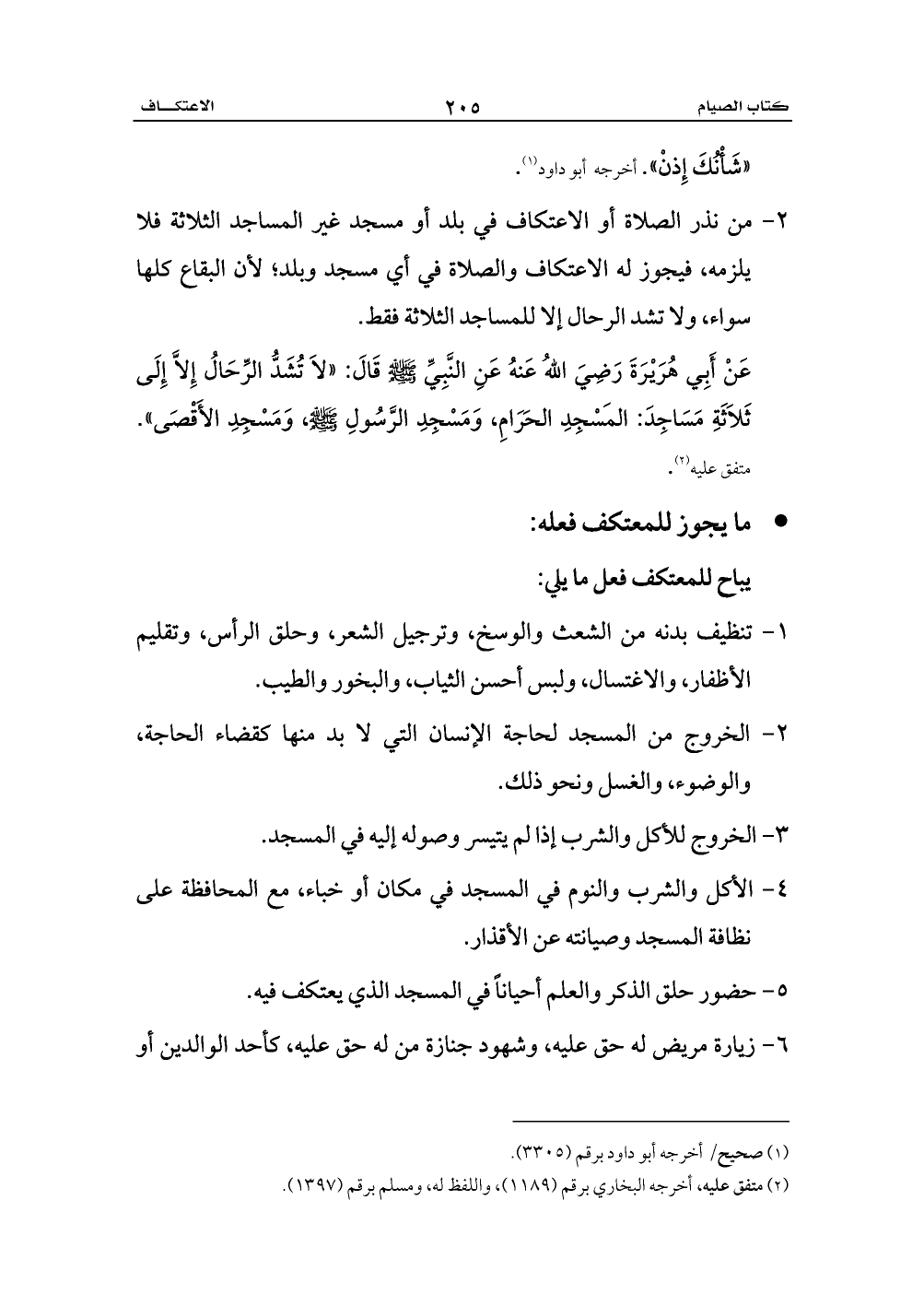 عَنْ أَبِي هُرَيْرَةَ رَضِيَ اللهُ عَنهُ عَنِ النَّبِيِّ - صلى الله عليه وسلم - قَالَ: «لاَ تُشَدُّ الرِّحَالُ إِلاَّ إِلَى ثَلاَثَةِ مَسَاجِدَ: المَسْجِدِ الحَرَامِ، وَمَسْجِدِ الرَّسُولِ - صلى الله عليه وسلم -، وَمَسْجِدِ الأَقْصَى». متفق عليه (¬2).