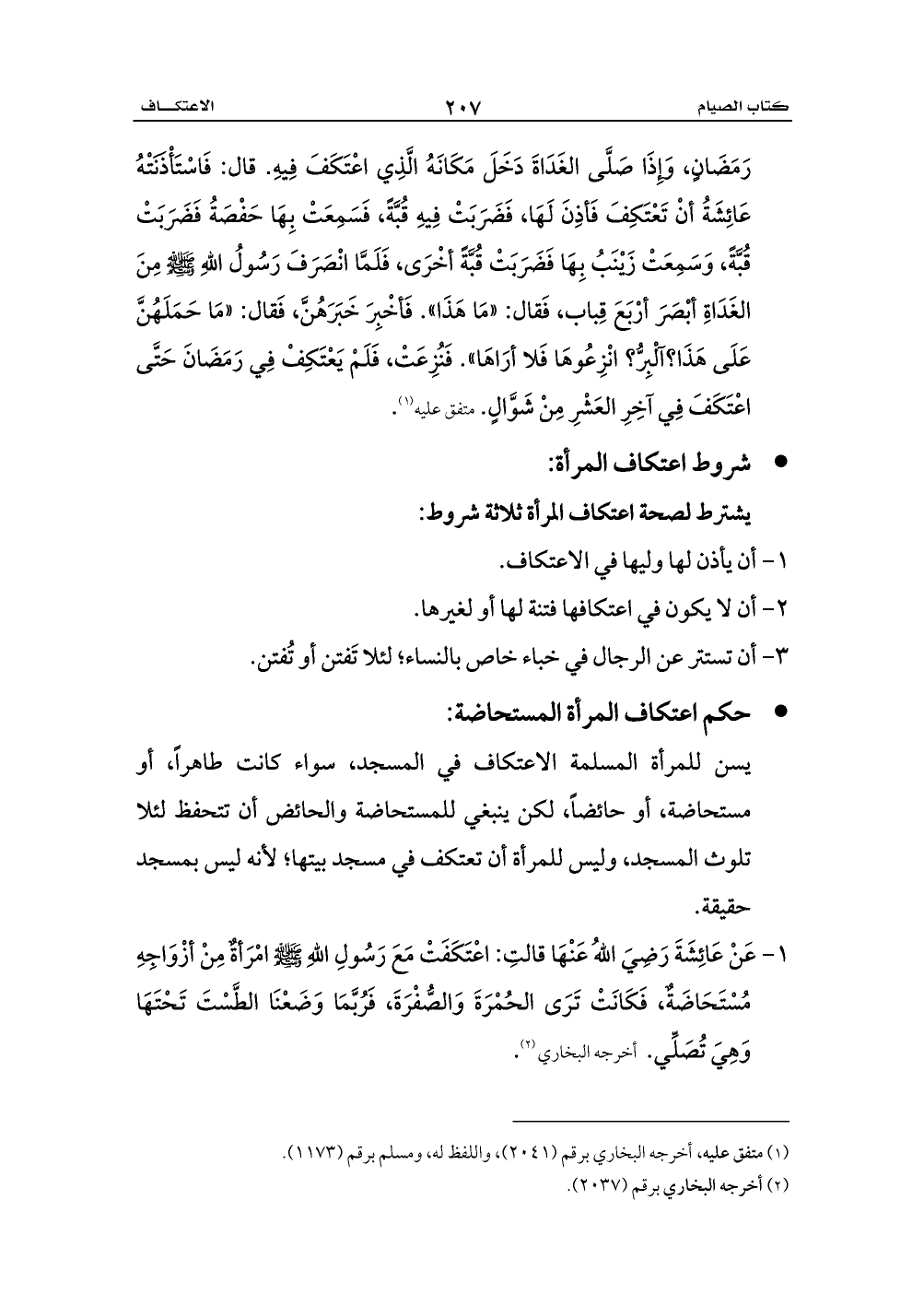 رَمَضَانٍ، وَإِذَا صَلَّى الغَدَاةَ دَخَلَ مَكَانَهُ الَّذِي اعْتَكَفَ فِيهِ. قال: فَاسْتَأْذَنَتْهُ عَائِشَةُ أنْ تَعْتَكِفَ فَأذِنَ لَهَا، فَضَرَبَتْ فِيهِ قُبَّةً، فَسَمِعَتْ بِهَا حَفْصَةُ فَضَرَبَتْ قُبَّةً، وَسَمِعَتْ زَيْنَبُ بِهَا فَضَرَبَتْ قُبَّةً أخْرَى، فَلَمَّا انْصَرَفَ رَسُولُ اللهِ - صلى الله عليه وسلم - مِنَ الغَدَاةِ أبْصَرَ أرْبَعَ قِباب، فَقال: «مَا هَذَا». فَأخْبِرَ خَبَرَهُنَّ، فَقال: «مَا حَمَلَهُنَّ عَلَى هَذَا؟ آلْبِرُّ؟ انْزِعُوهَا فَلا أرَاهَا». فَنُزِعَتْ، فَلَمْ يَعْتَكِفْ فِي رَمَضَانَ حَتَّى اعْتَكَفَ فِي آخِرِ العَشْرِ مِنْ شَوَّالٍ. متفق عليه (¬1).