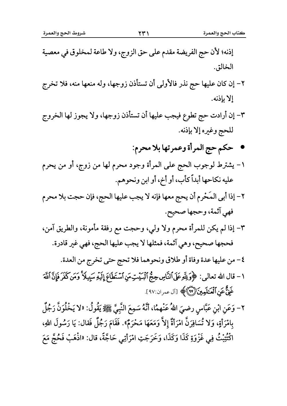 1 - يشترط لوجوب الحج على المرأة وجود محرم لها من زوج، أو من يحرم عليه نكاحها أبداً كأب، أو أخ، أو ابن ونحوهم.