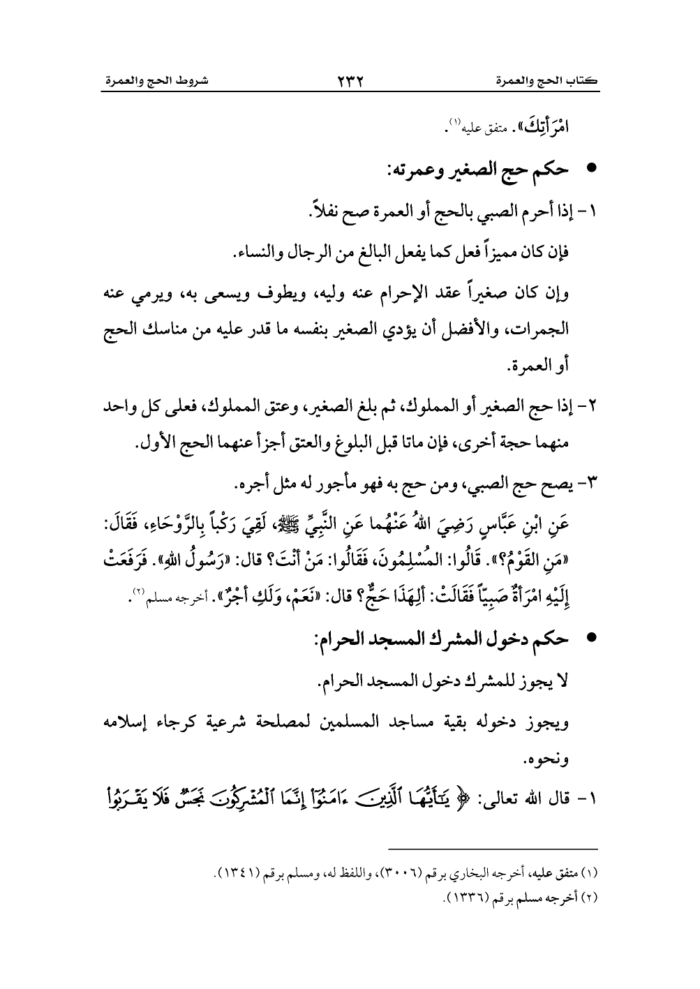 عَنِ ابْنِ عَبَّاسٍ رَضِيَ اللهُ عَنْهُما عَنِ النَّبِيِّ - صلى الله عليه وسلم -، لَقِيَ رَكْباً بِالرَّوْحَاءِ، فَقَالَ: «مَنِ القَوْمُ؟». قَالُوا: المُسْلِمُونَ، فَقَالُوا: مَنْ أنْتَ؟ قال: «رَسُولُ اللهِ». فَرَفَعَتْ إِلَيْهِ امْرَأةٌ صَبِيّاً فَقَالَتْ: ألِهَذَا حَجٌّ؟ قال: «نَعَمْ، وَلَكِ أجْرٌ». أخرجه مسلم (¬2).