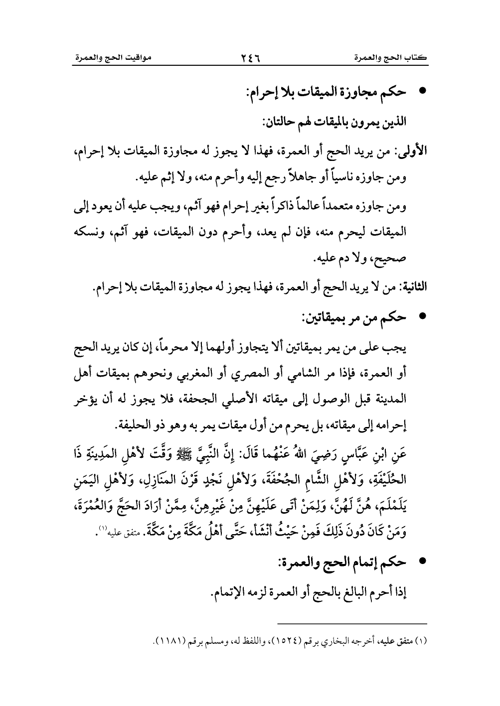 عَنِ ابْنِ عَبَّاسٍ رَضِيَ اللهُ عَنْهُما قَالَ: إِنَّ النَّبِيَّ - صلى الله عليه وسلم - وَقَّتَ لأهْلِ المَدِينَةِ ذَا الحُلَيْفَةِ، وَلأهْلِ الشَّامِ الجُحْفَةَ، وَلأهْلِ نَجْدٍ قَرْنَ المَنَازِلِ، وَلأهْلِ اليَمَنِ يَلَمْلَمَ، هُنَّ لَهُنَّ، وَلِمَنْ أتَى عَلَيْهِنَّ مِنْ غَيْرِهِنَّ، مِمَّنْ أرَادَ الحَجَّ وَالعُمْرَةَ، وَمَنْ كَانَ دُونَ ذَلِكَ فَمِنْ حَيْثُ أنْشَأ، حَتَّى أهْلُ مَكَّةَ مِنْ مَكَّةَ. متفق عليه (¬1).