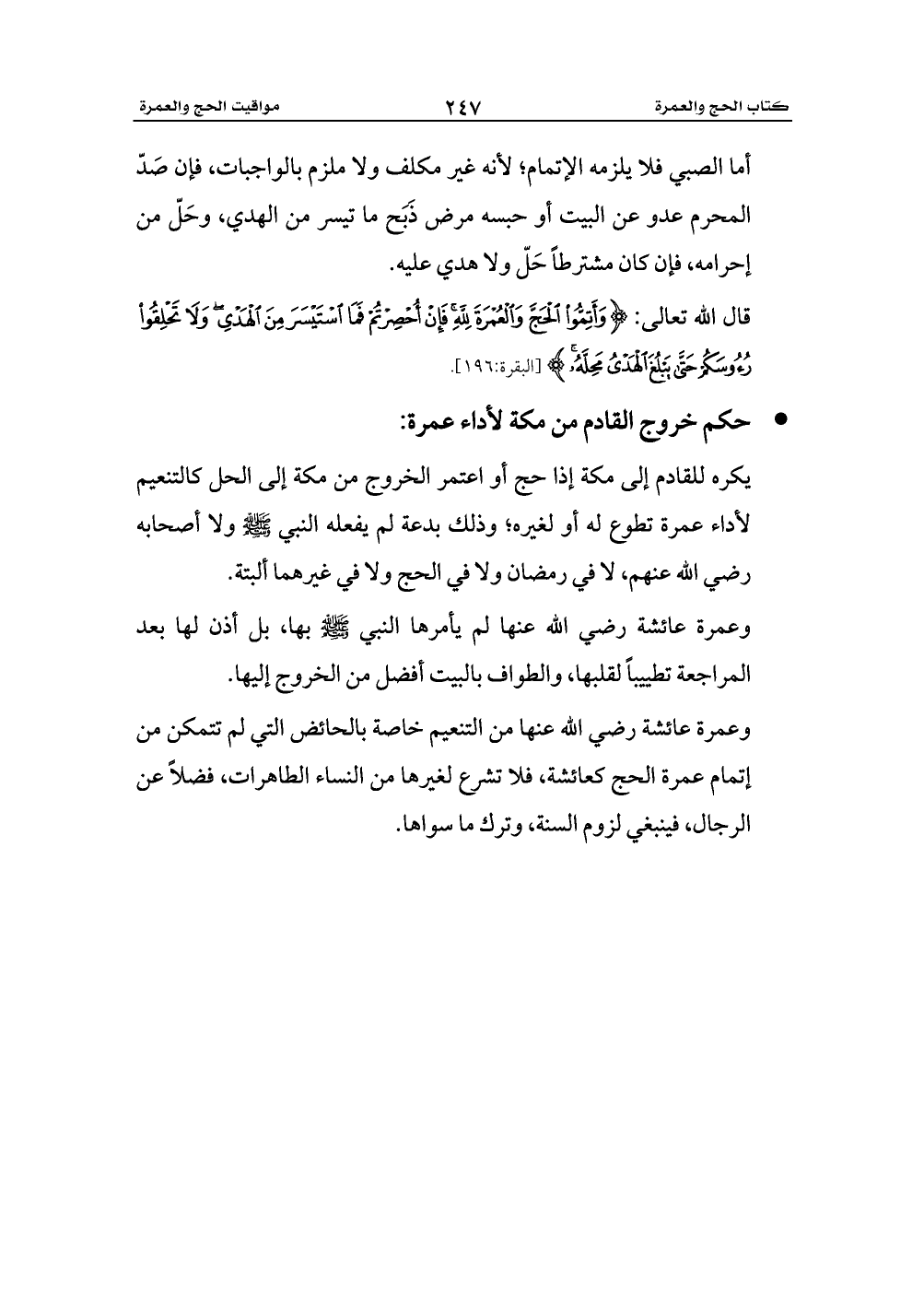 أما الصبي فلا يلزمه الإتمام؛ لأنه غير مكلف ولا ملزم بالواجبات، فإن صَدّ المحرم عدو عن البيت أو حبسه مرض ذَبَح ما تيسر من الهدي، وحَلّ من إحرامه، فإن كان مشترطاً حَلّ ولا هدي عليه.
