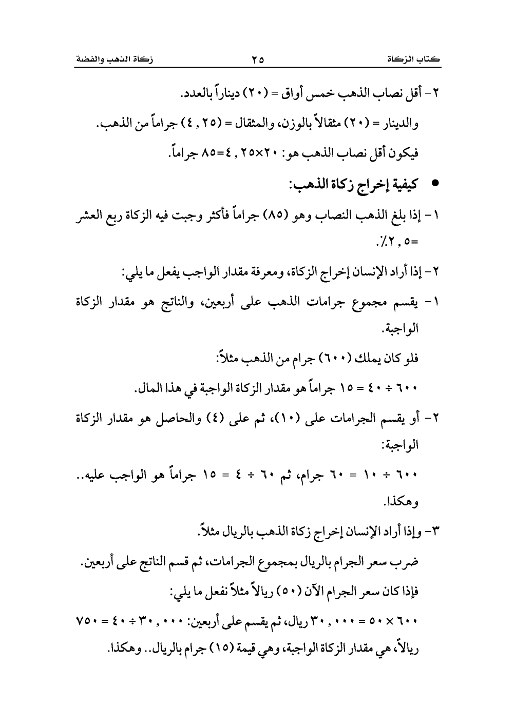 600 × 50 = 30.000 ريال، ثم يقسم على أربعين: 30.000 ÷ 40 = 750 ريالاً، هي مقدار الزكاة الواجبة، وهي قيمة (15) جرام بالريال .. وهكذا.