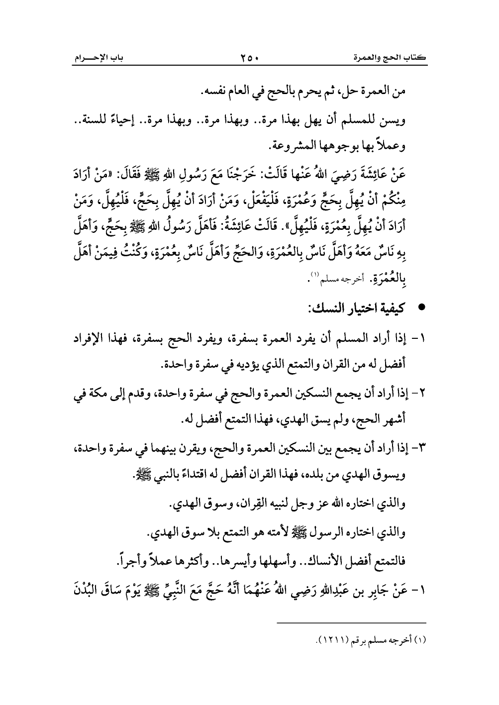 عَنْ عَائِشَةَ رَضِيَ اللهُ عَنْها قَالَتْ: خَرَجْنَا مَعَ رَسُولِ اللهِ - صلى الله عليه وسلم - فَقَالَ: «مَنْ أرَادَ مِنْكُمْ أنْ يُهِلَّ بِحَجٍّ وَعُمْرَةٍ، فَلْيَفْعَلْ، وَمَنْ أرَادَ أنْ يُهِلَّ بِحَجٍّ، فَلْيُهِلَّ، وَمَنْ أرَادَ أنْ يُهِلَّ بِعُمْرَةٍ، فَلْيُهِلَّ». قَالَتْ عَائِشَةُ: فَأهَلَّ رَسُولُ اللهِ - صلى الله عليه وسلم - بِحَجٍّ، وَأهَلَّ بِهِ نَاسٌ مَعَهُ وَأهَلَّ نَاسٌ بِالعُمْرَةِ، وَالحَجِّ وَأهَلَّ نَاسٌ بِعُمْرَةٍ، وَكُنْتُ فِيمَنْ أهَلَّ بِالعُمْرَةِ. أخرجه مسلم (¬1).