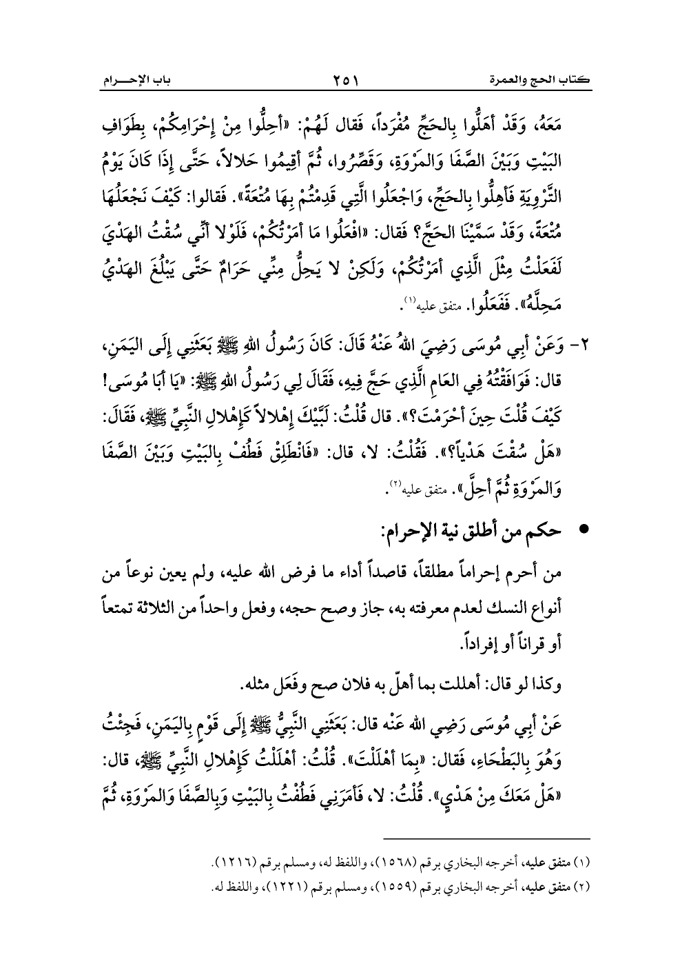 مَعَهُ، وَقَدْ أهَلُّوا بِالحَجِّ مُفْرَداً، فَقال لَهُمْ: «أحِلُّوا مِنْ إِحْرَامِكُمْ، بِطَوَافِ البَيْتِ وَبَيْنَ الصَّفَا وَالمَرْوَةِ، وَقَصِّرُوا، ثُمَّ أقِيمُوا حَلالاً، حَتَّى إِذَا كَانَ يَوْمُ التَّرْوِيَةِ فَأهِلُّوا بِالحَجِّ، وَاجْعَلُوا الَّتِي قَدِمْتُمْ بِهَا مُتْعَةً». فَقالوا: كَيْفَ نَجْعَلُهَا مُتْعَةً، وَقَدْ سَمَّيْنَا الحَجَّ؟ فَقال: «افْعَلُوا مَا أمَرْتُكُمْ، فَلَوْلا أنِّي سُقْتُ الهَدْيَ لَفَعَلْتُ مِثْلَ الَّذِي أمَرْتُكُمْ، وَلَكِنْ لا يَحِلُّ مِنِّي حَرَامٌ حَتَّى يَبْلُغَ الهَدْيُ مَحِلَّهُ». فَفَعَلُوا. متفق عليه (¬1).
