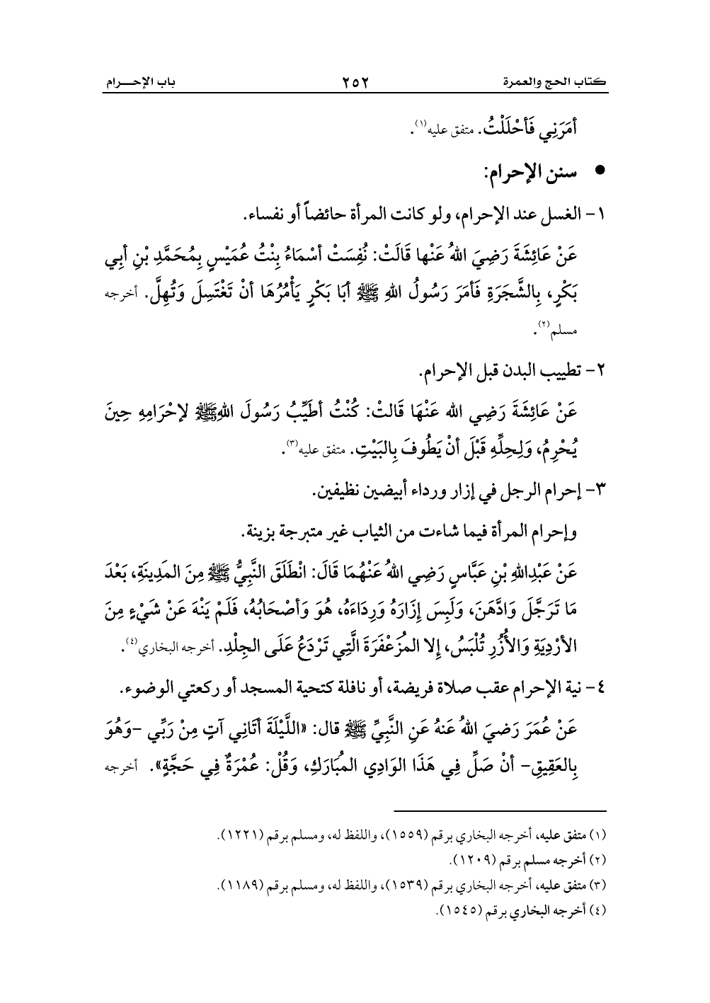 عَنْ عَائِشَةَ رَضِيَ اللهُ عَنْها قَالَتْ: نُفِسَتْ أسْمَاءُ بِنْتُ عُمَيْسٍ بِمُحَمَّدِ بْنِ أبِي بَكْرٍ، بِالشَّجَرَةِ فَأمَرَ رَسُولُ اللهِ - صلى الله عليه وسلم - أبَا بَكْرٍ يَأْمُرُهَا أنْ تَغْتَسِلَ وَتُهِلَّ. أخرجه مسلم (¬2).