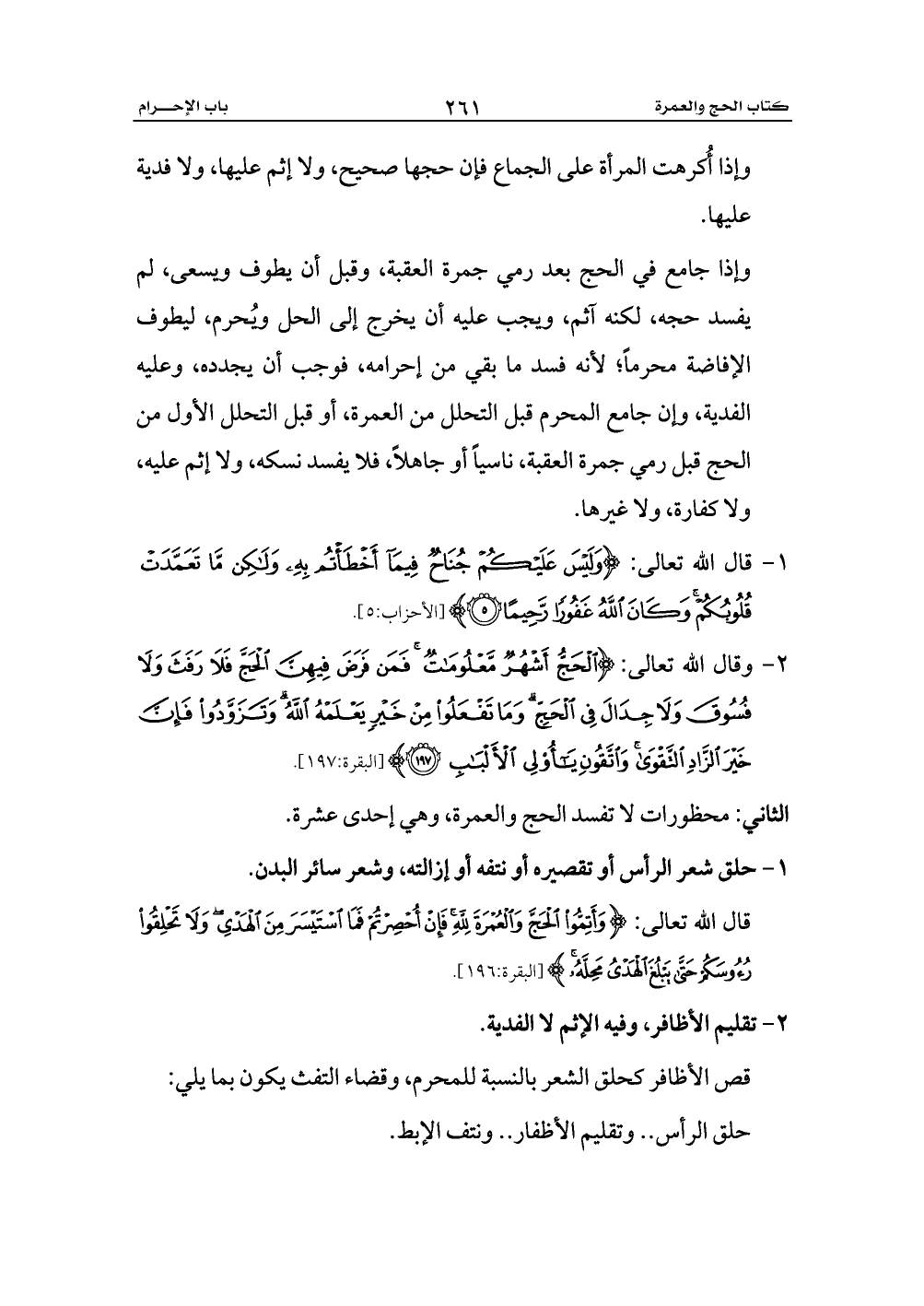 الثاني: محظورات لا تفسد الحج والعمرة، وهي إحدى عشرة.