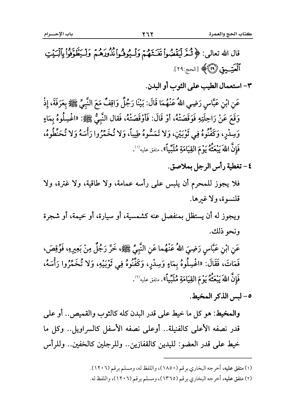 عَنِ ابْنِ عَبَّاسٍ رَضِي اللهُ عَنْهُمَا قَالَ: بَيْنَا رَجُلٌ وَاقِفٌ مَعَ النَّبِيِّ - صلى الله عليه وسلم - بِعَرَفَةَ، إِذْ وَقَعَ عَنْ رَاحِلَتِهِ فَوَقَصَتْهُ، أوْ قَالَ: فَأوْقَصَتْهُ، فَقال النَّبِيُّ - صلى الله عليه وسلم -: «اغْسِلُوهُ بِمَاءٍ وَسِدْرٍ، وَكَفِّنُوهُ فِي ثَوْبَيْنِ، وَلا تَمَسُّوهُ طِيباً، وَلا تُخَمِّرُوا رَأْسَهُ وَلا تُحَنِّطُوهُ، فَإِنَّ اللهَ يَبْعَثُهُ يَوْمَ القِيَامَةِ مُلَبِّياً». متفق عليه (¬1).