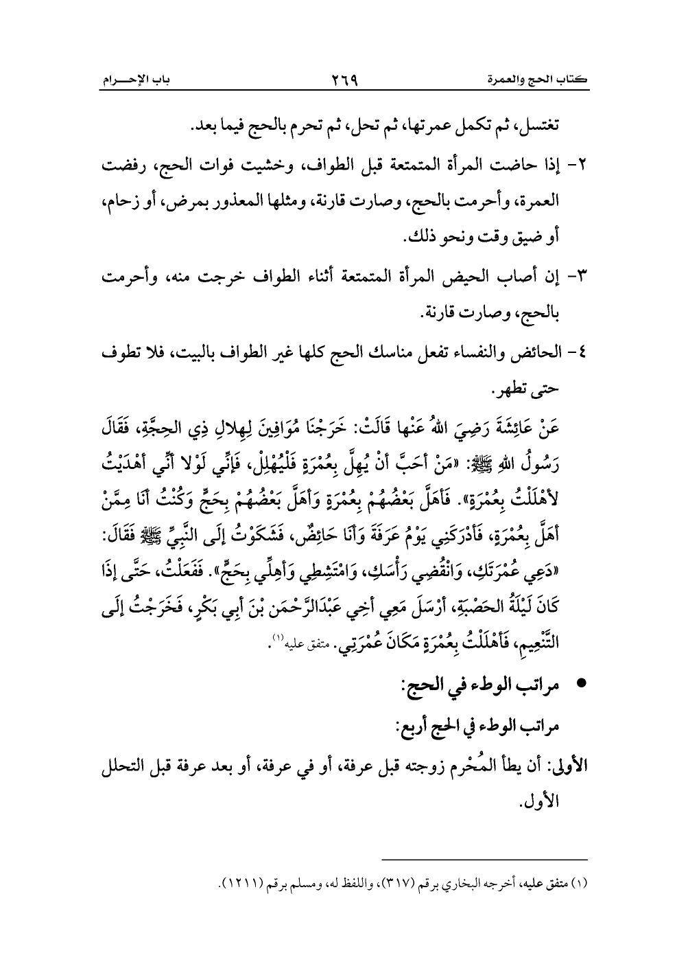 عَنْ عَائِشَةَ رَضِيَ اللهُ عَنْها قَالَتْ: خَرَجْنَا مُوَافِينَ لِهِلالِ ذِي الحِجَّةِ، فَقَالَ رَسُولُ اللهِ - صلى الله عليه وسلم -: «مَنْ أحَبَّ أنْ يُهِلَّ بِعُمْرَةٍ فَلْيُهْلِلْ، فَإنِّي لَوْلا أنِّي أهْدَيْتُ لأهْلَلْتُ بِعُمْرَةٍ». فَأهَلَّ بَعْضُهُمْ بِعُمْرَةٍ وَأهَلَّ بَعْضُهُمْ بِحَجٍّ وَكُنْتُ أنَا مِمَّنْ أهَلَّ بِعُمْرَةٍ، فَأدْرَكَنِي يَوْمُ عَرَفَةَ وَأنَا حَائِضٌ، فَشَكَوْتُ إلَى النَّبِيِّ - صلى الله عليه وسلم - فَقَالَ: «دَعِي عُمْرَتَكِ، وَانْقُضِي رَأْسَكِ، وَامْتَشِطِي وَأهِلِّي بِحَجٍّ». فَفَعَلْتُ، حَتَّى إذَا كَانَ لَيْلَةُ الحَصْبَةِ، أرْسَلَ مَعِي أخِي عَبْدَالرَّحْمَن بْنَ أبِي بَكْرٍ، فَخَرَجْتُ إلَى