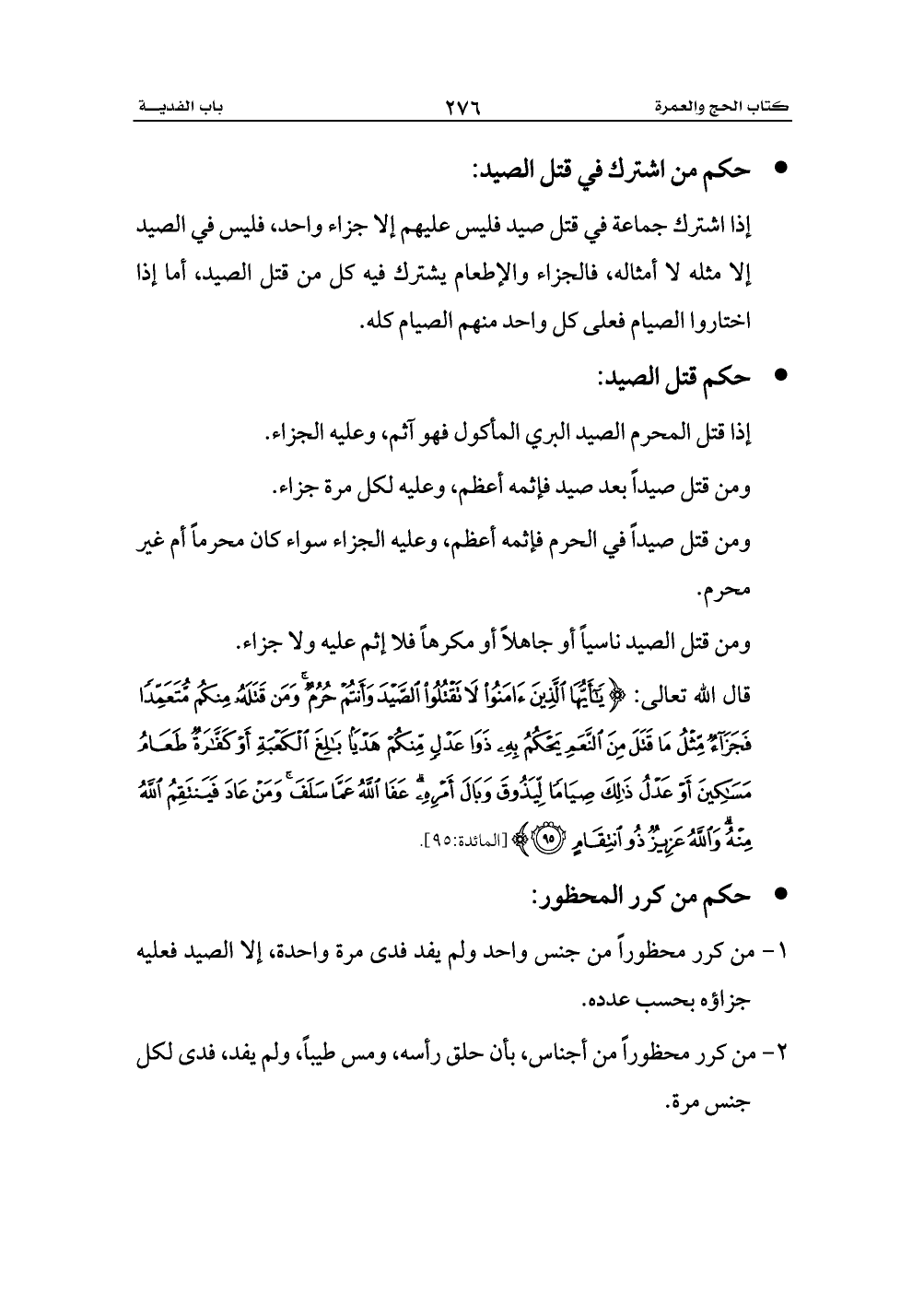 1 - من كرر محظوراً من جنس واحد ولم يفد فدى مرة واحدة، إلا الصيد فعليه جزاؤه بحسب عدده.