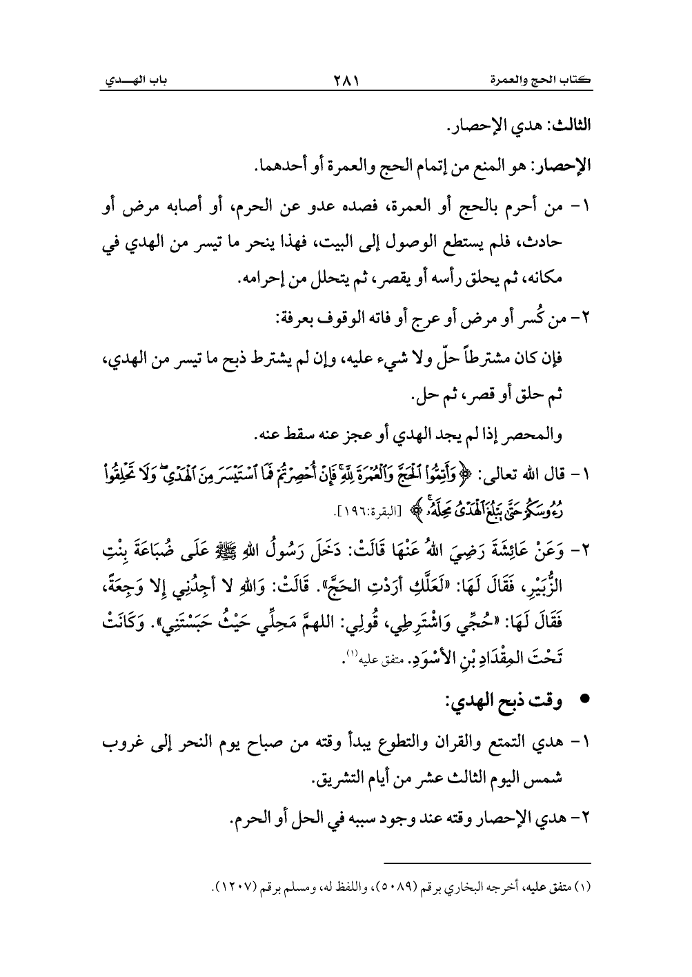 1 - قال الله تعالى: {وَأَتِمُّوا الْحَجَّ وَالْعُمْرَةَ لِلَّهِ فَإِنْ أُحْصِرْتُمْ فَمَا اسْتَيْسَرَ مِنَ الْهَدْيِ وَلَا تَحْلِقُوا رُءُوسَكُمْ حَتَّى يَبْلُغَ الْهَدْيُ مَحِلَّهُ} [البقرة:196].