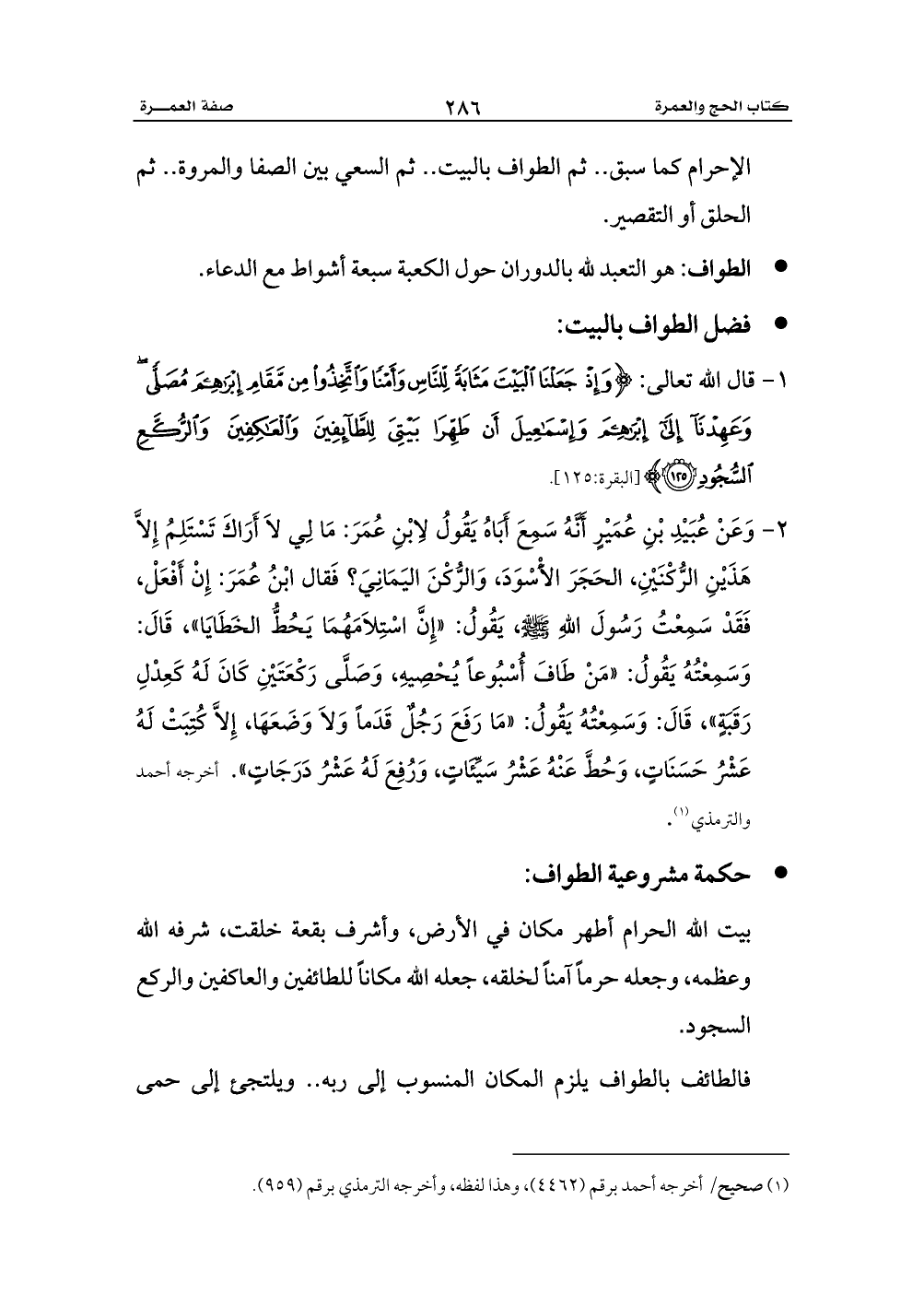 2 - وَعَنْ عُبَيْدِ بْنِ عُمَيْرٍ أَنَّهُ سَمِعَ أَبَاهُ يَقُولُ لاِبْنِ عُمَرَ: مَا لِي لاَ أَرَاكَ تَسْتَلِمُ إِلاَّ هَذَيْنِ الرُّكْنَيْنِ، الحَجَرَ الأَْسْوَدَ، وَالرُّكْنَ اليَمَانِيَ؟ فَقال ابْنُ عُمَرَ: إِنْ أَفْعَلْ، فَقَدْ سَمِعْتُ رَسُولَ اللهِ - صلى الله عليه وسلم -، يَقُولُ: «إِنَّ اسْتِلاَمَهُمَا يَحُطُّ الخَطَايَا»، قَالَ: وَسَمِعْتُهُ يَقُولُ: «مَنْ طَافَ أُسْبُوعاً يُحْصِيهِ، وَصَلَّى رَكْعَتَيْنِ كَانَ لَهُ كَعِدْلِ رَقَبَةٍ»، قَالَ: وَسَمِعْتُهُ يَقُولُ: «مَا رَفَعَ رَجُلٌ قَدَماً وَلاَ وَضَعَهَا، إِلاَّ كُتِبَتْ لَهُ عَشْرُ حَسَنَاتٍ، وَحُطَّ عَنْهُ عَشْرُ سَيِّئَاتٍ، وَرُفِعَ لَهُ عَشْرُ دَرَجَاتٍ». أخرجه أحمد والترمذي (¬1).