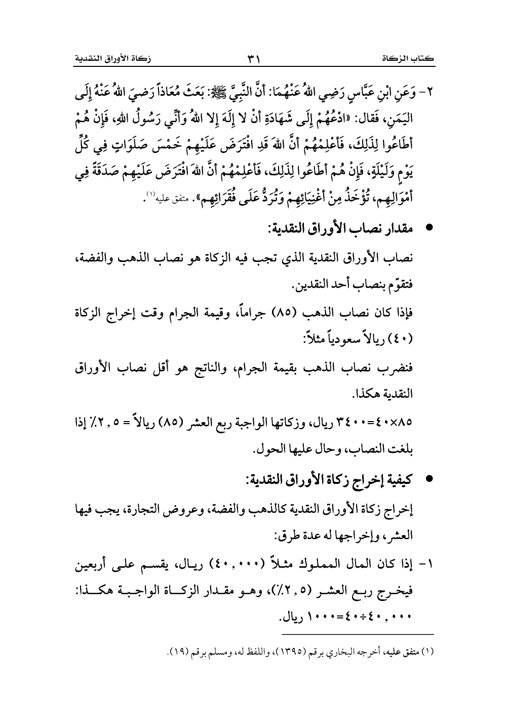 1 - إذا كان المال المملوك مثلاً (40.000) ريال، يقسم على أربعين فيخرج ربع العشر (2.5%)، وهو مقدار الزكاة الواجبة هكذا: