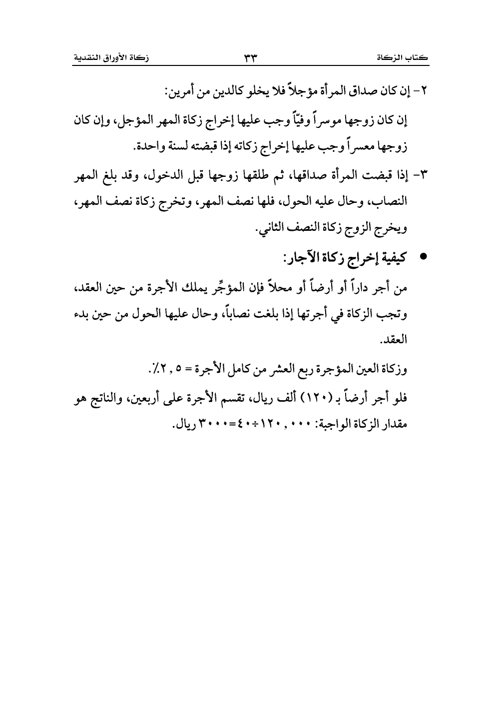 فلو أجر أرضاً بـ (120) ألف ريال، تقسم الأجرة على أربعين، والناتج هو مقدار الزكاة الواجبة: 120.000÷40=3000 ريال.