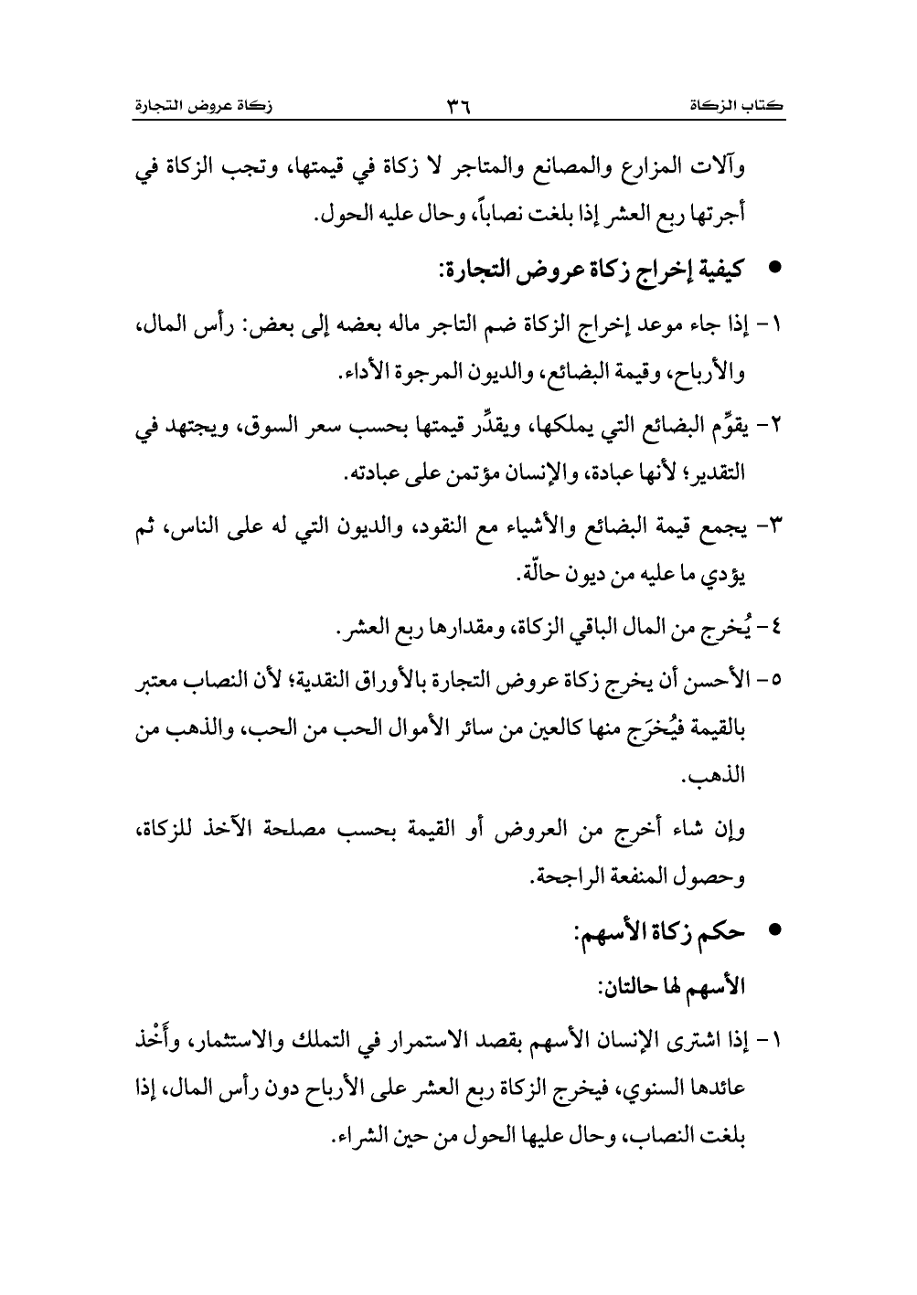 1 - إذا اشترى الإنسان الأسهم بقصد الاستمرار في التملك والاستثمار، وأَخْذ عائدها السنوي، فيخرج الزكاة ربع العشر على الأرباح دون رأس المال، إذا بلغت النصاب، وحال عليها الحول من حين الشراء.