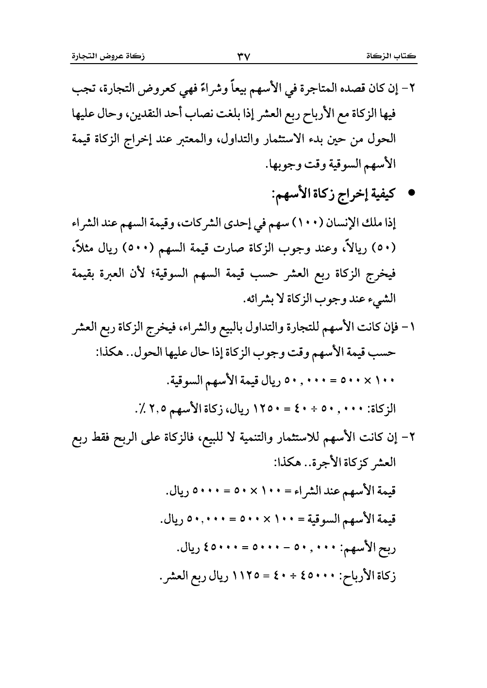 الزكاة: 50.000 ÷ 40 = 1250 ريال، زكاة الأسهم 2.5 %.