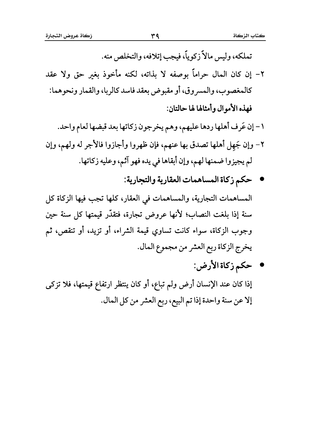 المساهمات التجارية، والمساهمات في العقار، كلها تجب فيها الزكاة كل سنة إذا بلغت النصاب؛ لأنها عروض تجارة، فتقدّر قيمتها كل سنة حين وجوب الزكاة، سواء كانت تساوي قيمة الشراء، أو تزيد، أو تنقص، ثم يخرج الزكاة ربع العشر من مجموع المال.