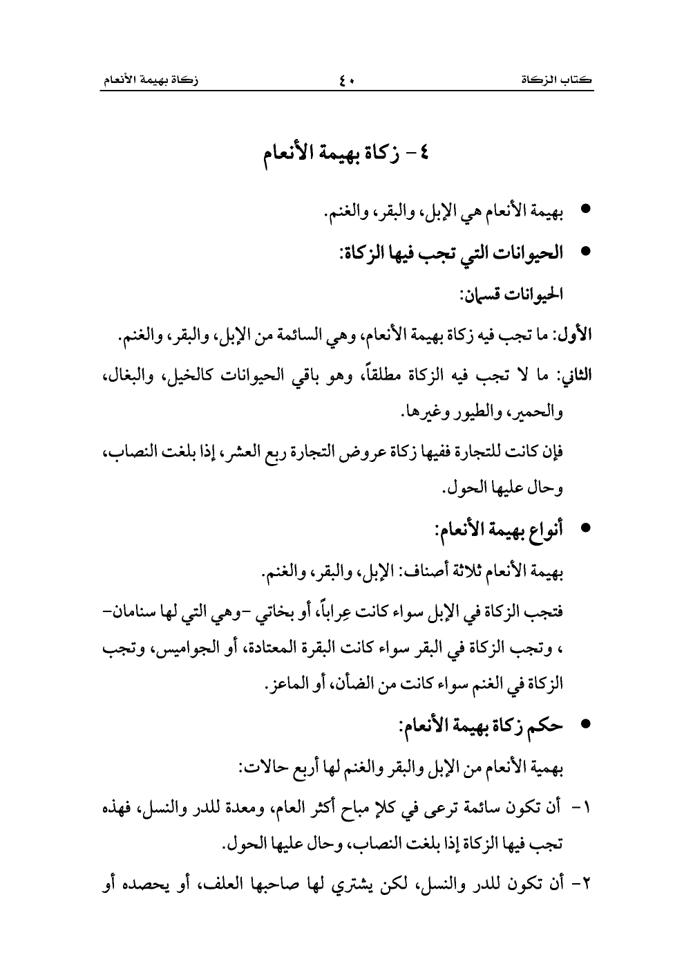 الأول: ما تجب فيه زكاة بهيمة الأنعام، وهي السائمة من الإبل، والبقر، والغنم.