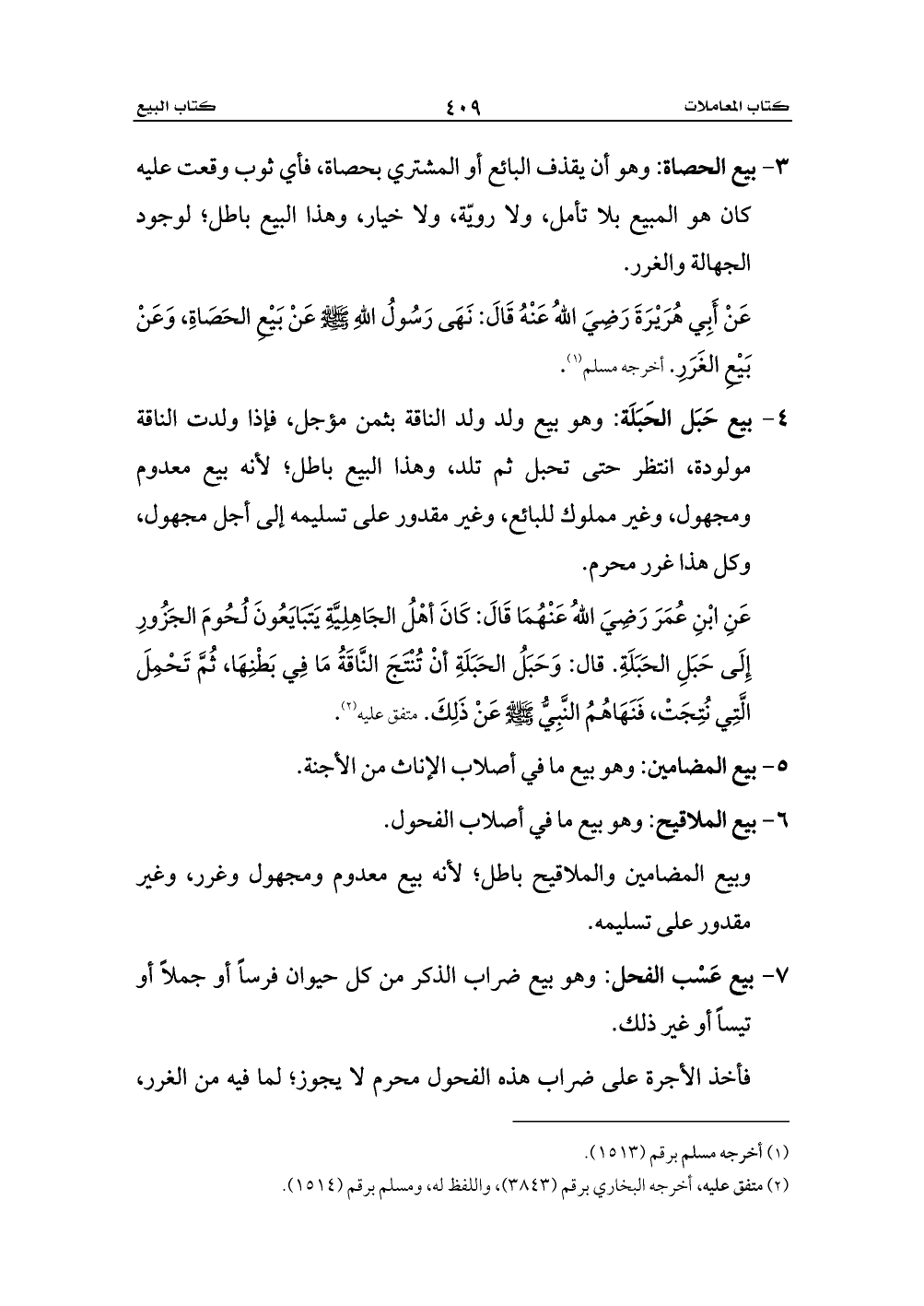 عَنِ ابْنِ عُمَرَ رَضِيَ اللهُ عَنْهُمَا قَالَ: كَانَ أهْلُ الجَاهِلِيَّةِ يَتَبَايَعُونَ لُحُومَ الجَزُورِ إِلَى حَبَلِ الحَبَلَةِ. قال: وَحَبَلُ الحَبَلَةِ أنْ تُنْتَجَ النَّاقَةُ مَا فِي بَطْنِهَا، ثُمَّ تَحْمِلَ الَّتِي نُتِجَتْ، فَنَهَاهُمُ النَّبِيُّ - صلى الله عليه وسلم - عَنْ ذَلِكَ. متفق عليه (¬2).