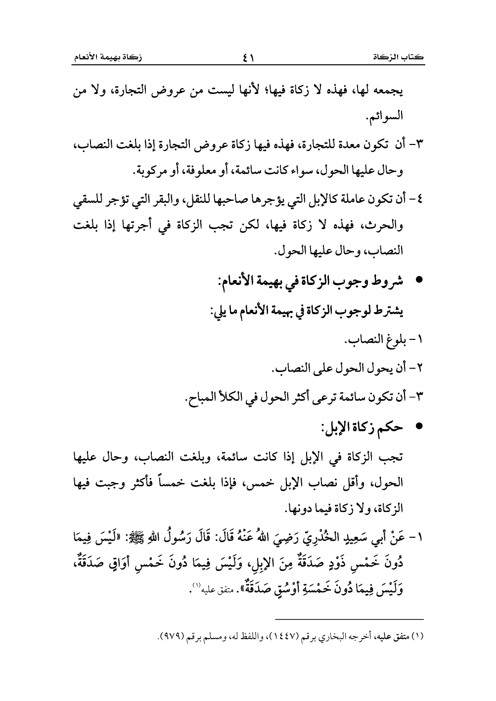 1 - عَنْ أبي سَعِيدٍ الخُدْرِيّ رَضِيَ اللهُ عَنْهُ قَالَ: قَالَ رَسُولُ اللهِ - صلى الله عليه وسلم -: «لَيْسَ فِيمَا دُونَ خَمْسِ ذَوْدٍ صَدَقَةٌ مِنَ الإبِلِ، وَلَيْسَ فِيمَا دُونَ خَمْسِ أوَاقٍ صَدَقَةٌ،