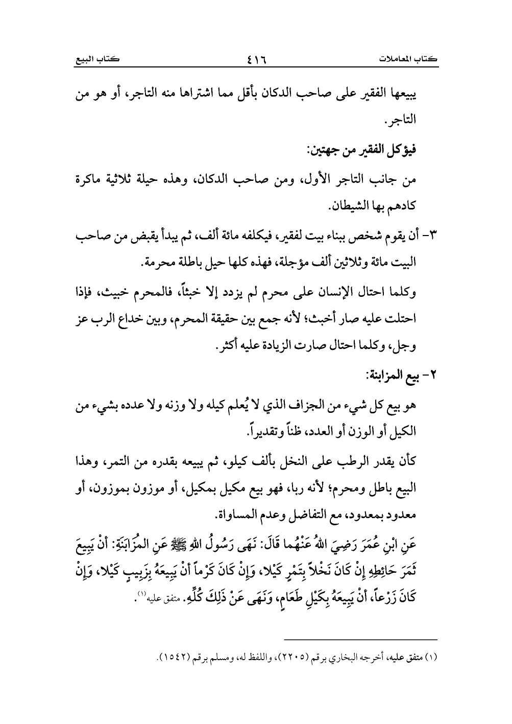 عَنِ ابْنِ عُمَرَ رَضِيَ اللهُ عَنْهُما قَالَ: نَهَى رَسُولُ اللهِ - صلى الله عليه وسلم - عَنِ المُزَابَنَةِ: أنْ يَبِيعَ ثَمَرَ حَائِطِهِ إِنْ كَانَ نَخْلاً بِتَمْرٍ كَيْلا، وَإِنْ كَانَ كَرْماً أنْ يَبِيعَهُ بِزَبِيبٍ كَيْلا، وَإِنْ كَانَ زَرْعاً، أنْ يَبِيعَهُ بِكَيْلِ طَعَامٍ، وَنَهَى عَنْ ذَلِكَ كُلِّهِ. متفق عليه (¬1).