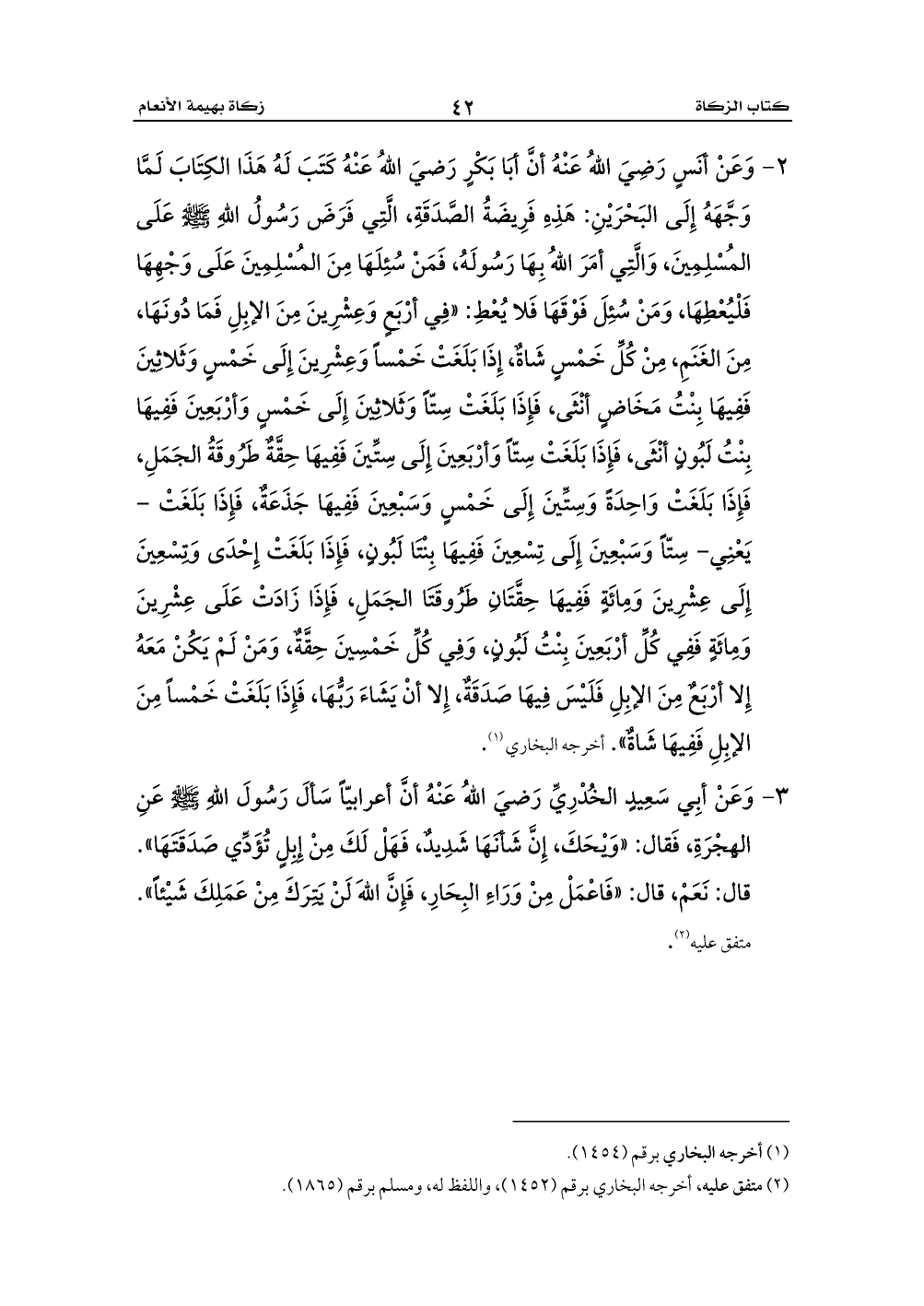 2 - وَعَنْ أنَسٍ رَضِيَ اللهُ عَنْهُ أنَّ أبَا بَكْرٍ رَضيَ اللهُ عَنْهُ كَتَبَ لَهُ هَذَا الكِتَابَ لَمَّا وَجَّهَهُ إِلَى البَحْرَيْنِ: هَذِهِ فَرِيضَةُ الصَّدَقَةِ، الَّتِي فَرَضَ رَسُولُ اللهِ - صلى الله عليه وسلم - عَلَى المُسْلِمِينَ، وَالَّتِي أمَرَ اللهُ بِهَا رَسُولَهُ، فَمَنْ سُئِلَهَا مِنَ المُسْلِمِينَ عَلَى وَجْهِهَا فَلْيُعْطِهَا، وَمَنْ سُئِلَ فَوْقَهَا فَلا يُعْطِ: «فِي أرْبَعٍ وَعِشْرِينَ مِنَ الإبِلِ فَمَا دُونَهَا، مِنَ الغَنَمِ، مِنْ كُلِّ خَمْسٍ شَاةٌ، إِذَا بَلَغَتْ خَمْساً وَعِشْرِينَ إِلَى خَمْسٍ وَثَلاثِينَ فَفِيهَا بِنْتُ مَخَاضٍ أنْثَى، فَإِذَا بَلَغَتْ سِتّاً وَثَلاثِينَ إِلَى خَمْسٍ وَأرْبَعِينَ فَفِيهَا بِنْتُ لَبُونٍ أنْثَى، فَإِذَا بَلَغَتْ سِتّاً وَأرْبَعِينَ إِلَى سِتِّينَ فَفِيهَا حِقَّةٌ طَرُوقَةُ الجَمَلِ، فَإِذَا بَلَغَتْ وَاحِدَةً وَسِتِّينَ إِلَى خَمْسٍ وَسَبْعِينَ فَفِيهَا جَذَعَةٌ، فَإِذَا بَلَغَتْ -يَعْنِي- سِتّاً وَسَبْعِينَ إِلَى تِسْعِينَ فَفِيهَا بِنْتَا لَبُونٍ، فَإِذَا بَلَغَتْ إِحْدَى وَتِسْعِينَ إِلَى عِشْرِينَ وَمِائَةٍ فَفِيهَا حِقَّتَانِ طَرُوقَتَا الجَمَلِ، فَإِذَا زَادَتْ عَلَى عِشْرِينَ وَمِائَةٍ فَفِي كُلِّ أرْبَعِينَ بِنْتُ لَبُونٍ، وَفِي كُلِّ خَمْسِينَ حِقَّةٌ، وَمَنْ لَمْ يَكُنْ مَعَهُ إِلا أرْبَعٌ مِنَ الإبِلِ فَلَيْسَ فِيهَا صَدَقَةٌ، إِلا أنْ يَشَاءَ رَبُّهَا، فَإِذَا بَلَغَتْ خَمْساً مِنَ الإبِلِ فَفِيهَا شَاةٌ». أخرجه البخاري (¬1).