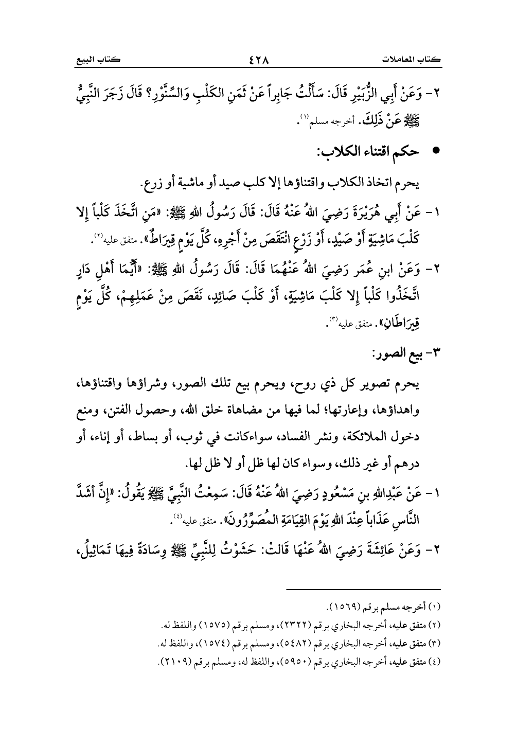 1 - عَنْ أَبِي هُرَيْرَةَ رَضِيَ اللهُ عَنْهُ قَالَ: قَالَ رَسُولُ اللهِ - صلى الله عليه وسلم -: «مَنِ اتَّخَذَ كَلْباً إِلا كَلْبَ مَاشِيَةٍ أَوْ صَيْدٍ، أَوْ زَرْعٍ انْتَقَصَ مِنْ أَجْرِهِ، كُلَّ يَوْمٍ قِيرَاطٌ». متفق عليه (¬2).