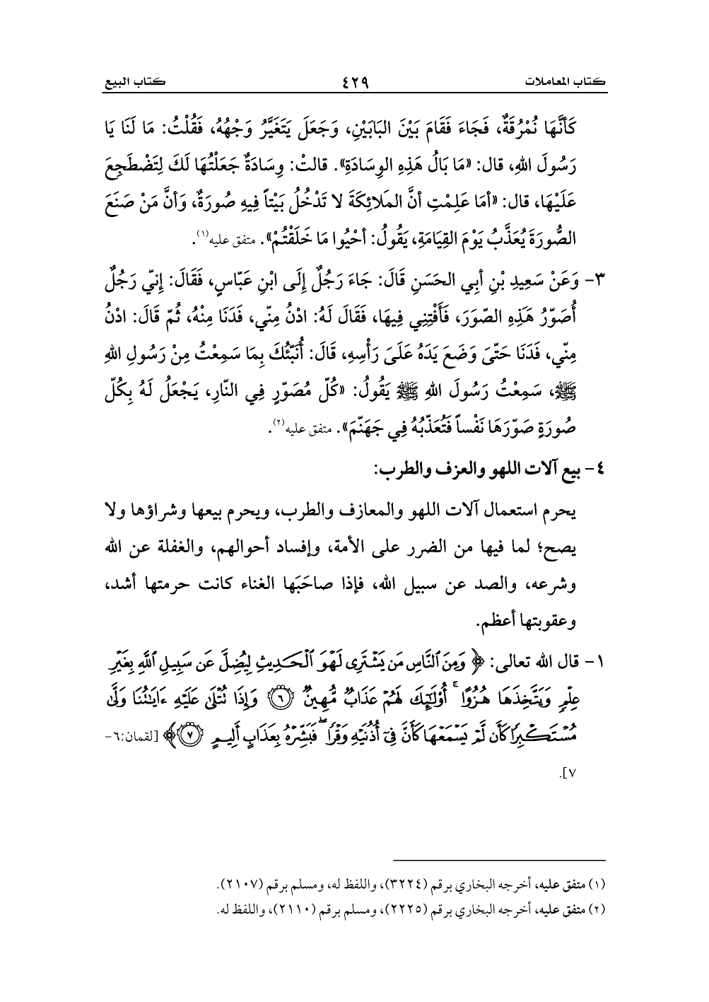1 - قال الله تعالى: {وَمِنَ النَّاسِ مَنْ يَشْتَرِي لَهْوَ الْحَدِيثِ لِيُضِلَّ عَنْ سَبِيلِ اللَّهِ بِغَيْرِ عِلْمٍ وَيَتَّخِذَهَا هُزُوًا أُولَئِكَ لَهُمْ عَذَابٌ مُهِينٌ (6) وَإِذَا تُتْلَى عَلَيْهِ آيَاتُنَا وَلَّى مُسْتَكْبِرًا كَأَنْ لَمْ يَسْمَعْهَا كَأَنَّ فِي أُذُنَيْهِ وَقْرًا فَبَشِّرْهُ بِعَذَابٍ أَلِيمٍ (7)} [لقمان:6 - 7].