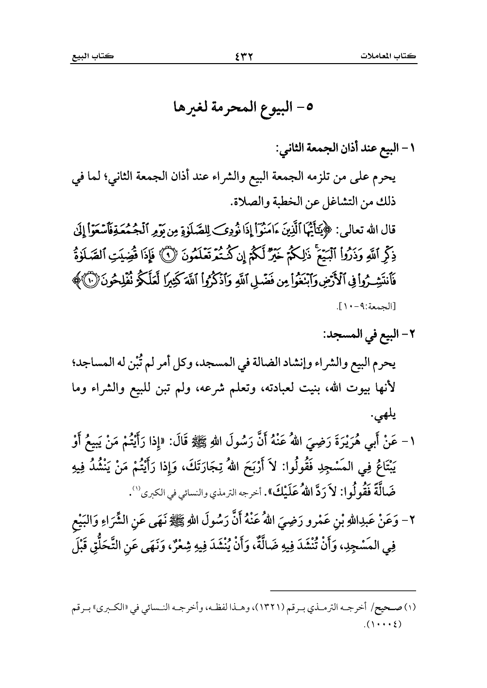 1 - عَنْ أَبي هُرَيْرَةَ رَضِيَ اللهُ عَنْهُ أَنَّ رَسُولَ اللهِ - صلى الله عليه وسلم - قَالَ: «إِذا رَأَيْتُمْ مَنْ يَبيعُ أَوْ يَبْتَاعُ فِي المَسْجِدِ فَقُولُوا: لاَ أَرْبَحَ اللهُ تِجَارَتَكَ، وَإِذا رَأَيْتُمْ مَنْ يَنْشُدُ فِيهِ ضَالَّةً فَقُولُوا: لاَ رَدَّ اللهُ عَلَيْكَ». أخرجه الترمذي والنسائي في الكبرى (¬1).