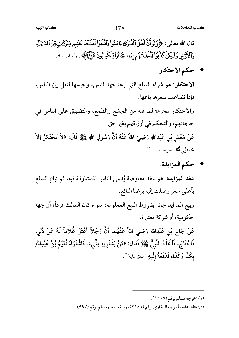 الاحتكار: هو شراء السلع التي يحتاجها الناس، وحبسها لتقل بين الناس، فإذا تضاعف سعرها باعها.