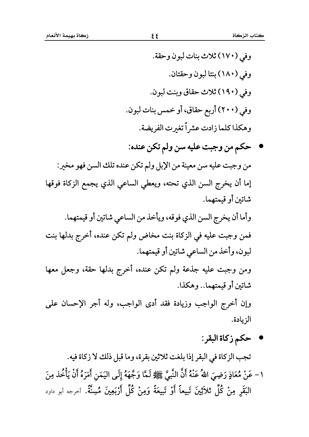 1 - عَنْ مُعَاذٍ رَضِيَ اللهُ عَنْهُ أَنَّ النَّبيَّ - صلى الله عليه وسلم - لَمَّا وَجَّهَهُ إِلَى اليَمَنِ أَمَرَهُ أَنْ يَأْخُذ مِنَ البَقَرِ مِنْ كُلِّ ثلاَثِينَ تَبيعاً أَوْ تَبيعَةً وَمِنْ كُلِّ أَرْبَعِينَ مُسِنَّةً. أخرجه أبو داود