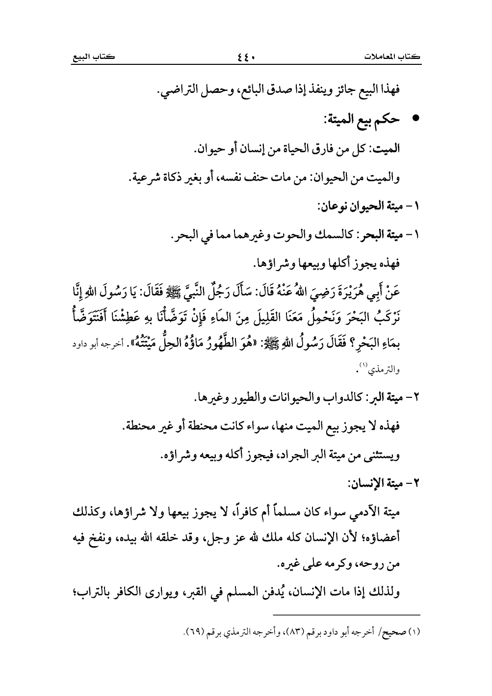 عَنْ أَبِي هُرَيْرَةَ رَضِيَ اللهُ عَنْهُ قَالَ: سَأَلَ رَجُلٌ النَّبيَّ - صلى الله عليه وسلم - فَقَالَ: يَا رَسُولَ اللهِ إِنَّا نَرْكَبُ البَحْرَ وَنَحْمِلُ مَعَنَا القَلِيلَ مِنَ المَاءِ فَإِنْ تَوَضَّأْنَا بهِ عَطِشْنَا أَفَنَتَوَضَّأُ بمَاءِ البَحْرِ؟ فَقَالَ رَسُولُ اللهِ - صلى الله عليه وسلم -: «هُوَ الطَّهُورُ مَاؤُهُ الحِلُّ مَيْتَتُهُ». أخرجه أبو داود والترمذي (¬1).