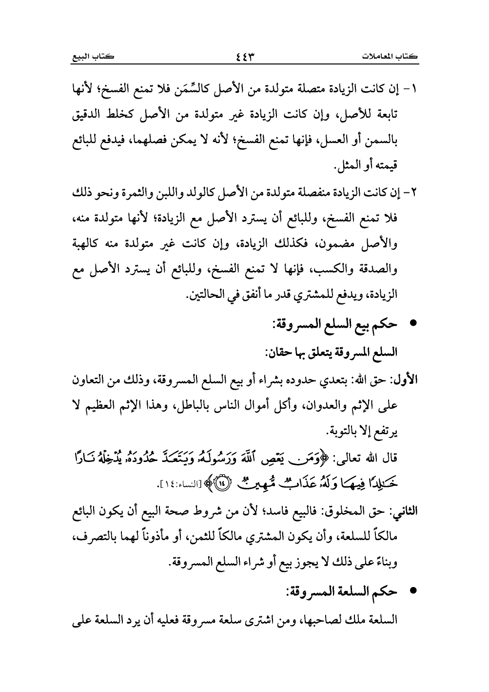 2 - إن كانت الزيادة منفصلة متولدة من الأصل كالولد واللبن والثمرة ونحو ذلك فلا تمنع الفسخ، وللبائع أن يسترد الأصل مع الزيادة؛ لأنها متولدة منه، والأصل مضمون، فكذلك الزيادة، وإن كانت غير متولدة منه كالهبة والصدقة والكسب، فإنها لا تمنع الفسخ، وللبائع أن يسترد الأصل مع الزيادة، ويدفع للمشتري قدر ما أنفق في الحالتين.