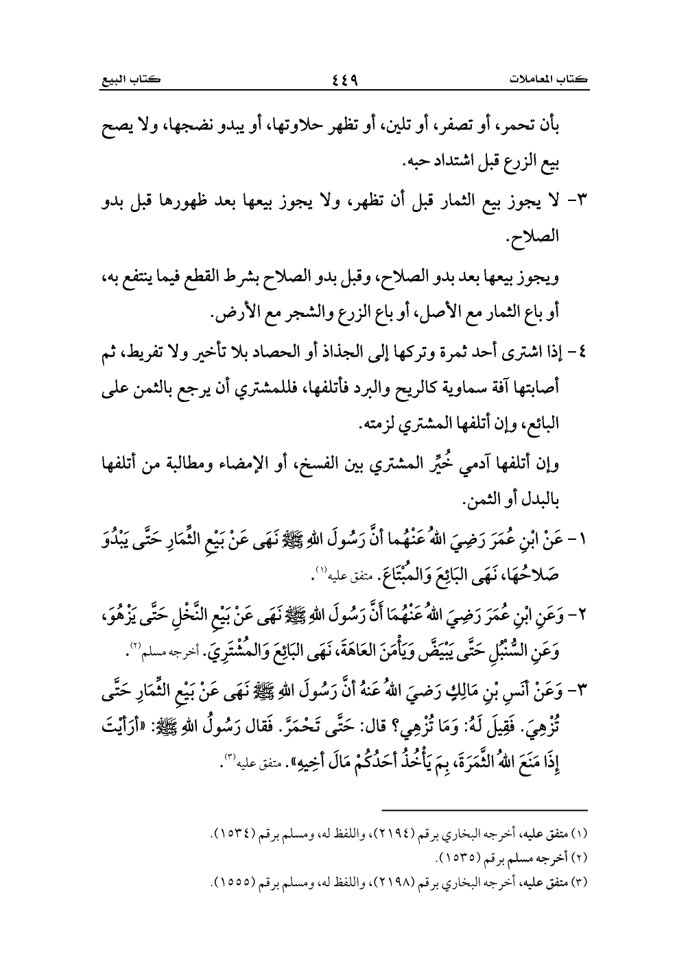 3 - لا يجوز بيع الثمار قبل أن تظهر، ولا يجوز بيعها بعد ظهورها قبل بدو الصلاح.