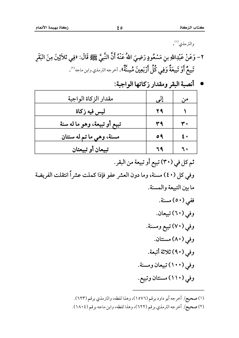 2 - وَعَنْ عَبْدِاللهِ بنِ مَسْعُودٍ رَضِيَ اللهُ عَنْهُ أَنَّ النَّبيَّ - صلى الله عليه وسلم - قَالَ: «فِي ثلاَثِينَ مِنَ البَقَرِ تَبيعٌ أَوْ تَبيعَةٌ وَفِي كُلِّ أَرْبَعِينَ مُسِنَّةٌ». أخرجه الترمذي وابن ماجه (¬2).