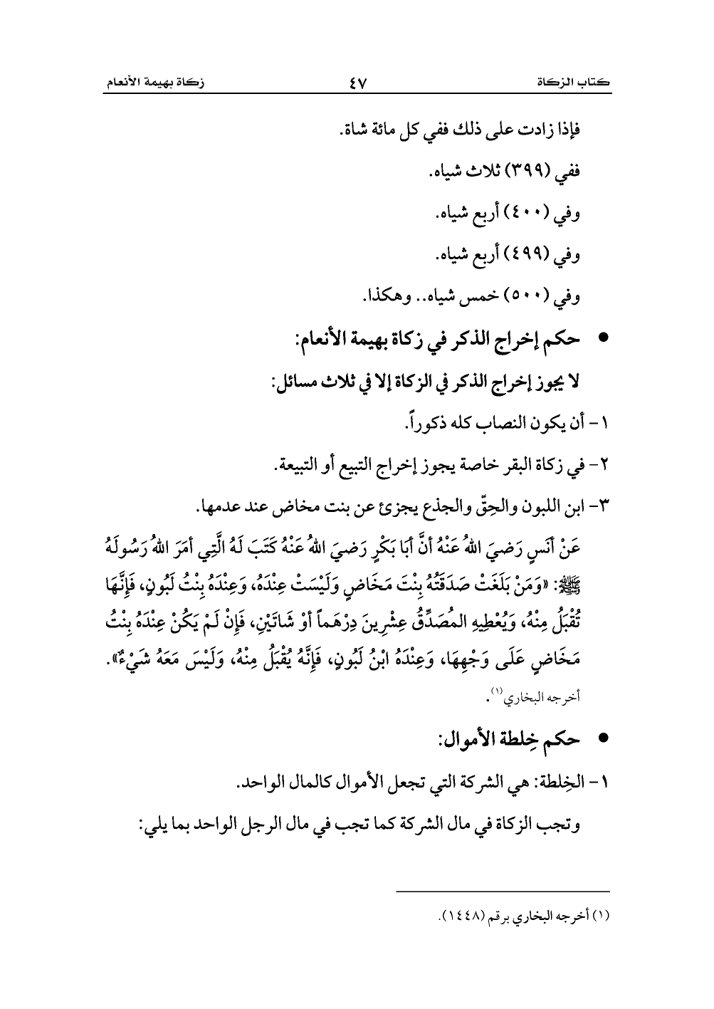 عَنْ أنَسٍ رَضيَ اللهُ عَنْهُ أنَّ أبَا بَكْرٍ رَضيَ اللهُ عَنْهُ كَتَبَ لَهُ الَّتِي أمَرَ اللهُ رَسُولَهُ - صلى الله عليه وسلم -: «وَمَنْ بَلَغَتْ صَدَقَتُهُ بِنْتَ مَخَاضٍ وَلَيْسَتْ عِنْدَهُ، وَعِنْدَهُ بِنْتُ لَبُونٍ، فَإِنَّهَا تُقْبَلُ مِنْهُ، وَيُعْطِيهِ المُصَدِّقُ عِشْرِينَ دِرْهَماً أوْ شَاتَيْنِ، فَإِنْ لَمْ يَكُنْ عِنْدَهُ بِنْتُ مَخَاضٍ عَلَى وَجْهِهَا، وَعِنْدَهُ ابْنُ لَبُونٍ، فَإِنَّهُ يُقْبَلُ مِنْهُ، وَلَيْسَ مَعَهُ شَيْءٌ». أخرجه البخاري (¬1).