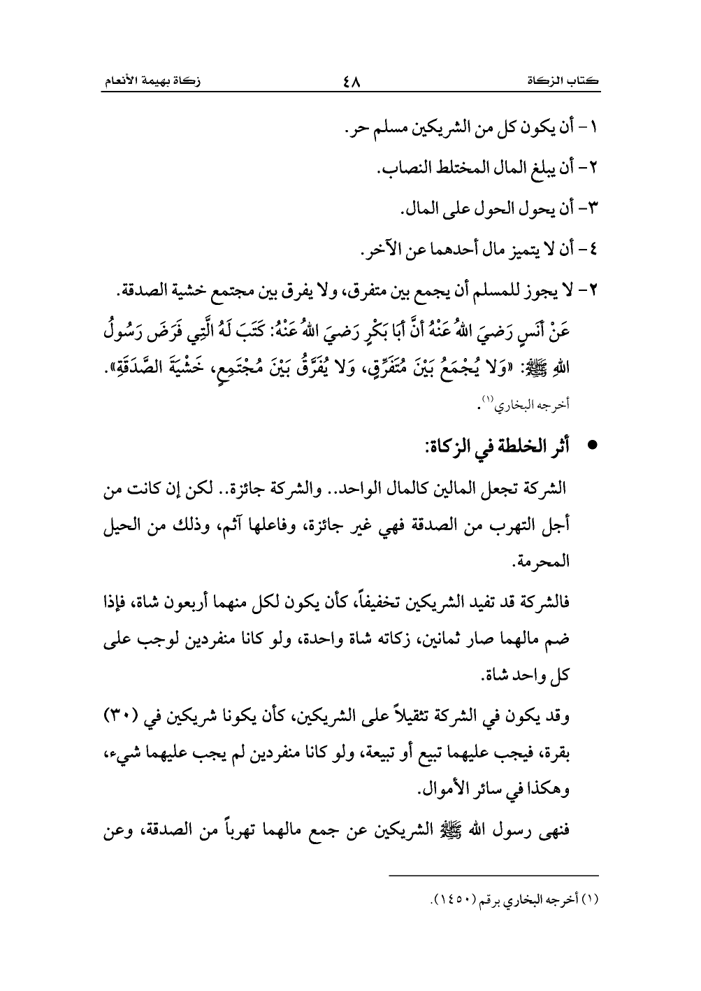 عَنْ أنَسٍ رَضيَ اللهُ عَنْهُ أنَّ أبَا بَكْرٍ رَضيَ اللهُ عَنْهُ: كَتَبَ لَهُ الَّتِي فَرَضَ رَسُولُ اللهِ - صلى الله عليه وسلم -: «وَلا يُجْمَعُ بَيْنَ مُتَفَرِّقٍ، وَلا يُفَرَّقُ بَيْنَ مُجْتَمِعٍ، خَشْيَةَ الصَّدَقَةِ». أخرجه البخاري (¬1).