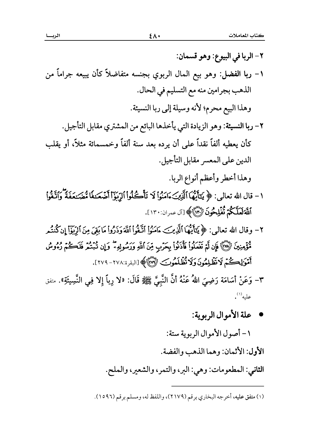 3 - وَعَنْ أسَامَة رَضِيَ اللهُ عَنْهُ أنَّ النَّبِيَّ - صلى الله عليه وسلم - قَالَ: «لا رِباً إِلا فِي النَّسِيئَةِ». متفق عليه (¬1).