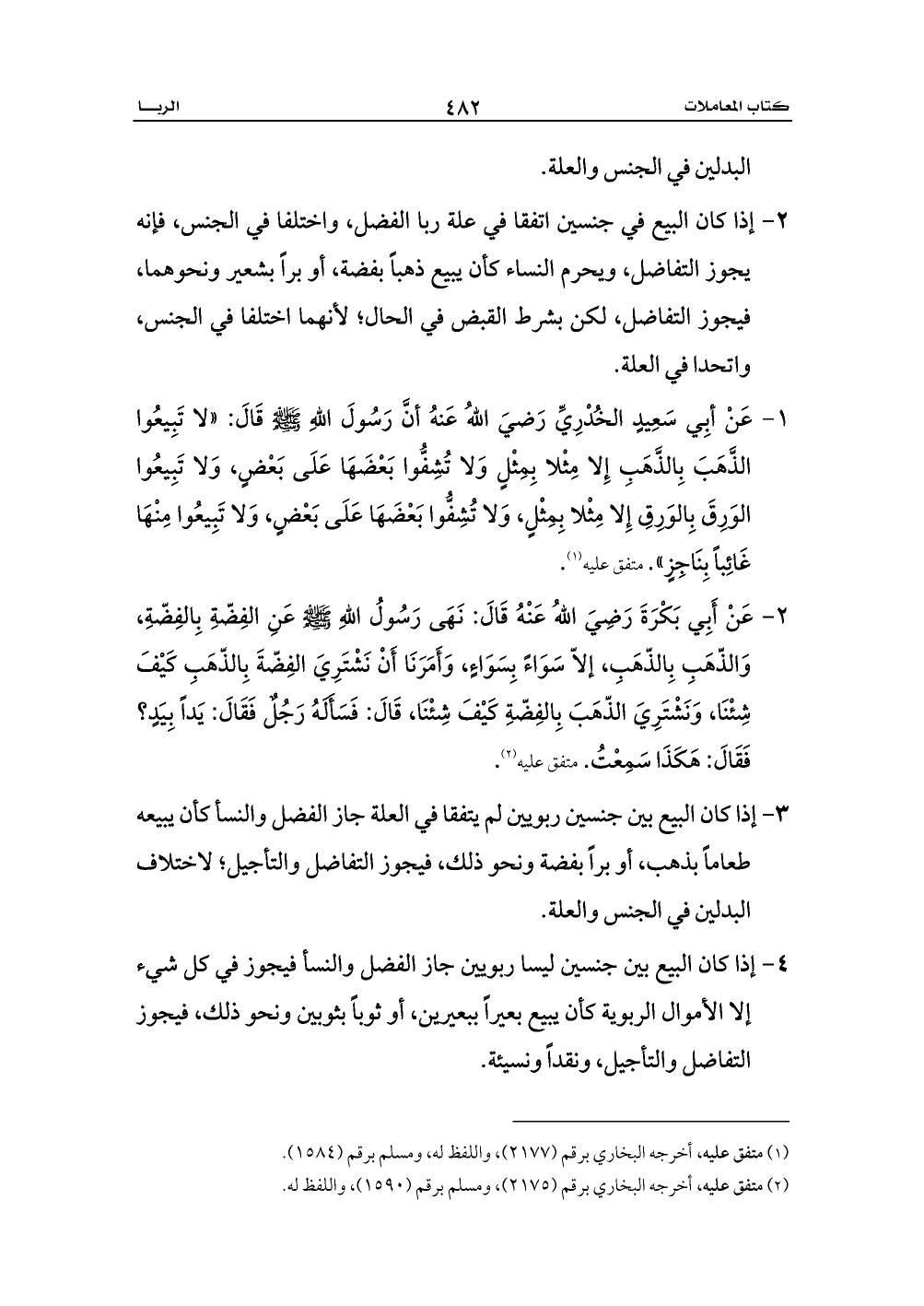 1 - عَنْ أبِي سَعِيدٍ الخُدْرِيِّ رَضيَ اللهُ عَنهُ أنَّ رَسُولَ اللهِ - صلى الله عليه وسلم - قَالَ: «لا تَبِيعُوا الذَّهَبَ بِالذَّهَبِ إِلا مِثْلا بِمِثْلٍ وَلا تُشِفُّوا بَعْضَهَا عَلَى بَعْضٍ، وَلا تَبِيعُوا الوَرِقَ بِالوَرِقِ إِلا مِثْلا بِمِثْلٍ، وَلا تُشِفُّوا بَعْضَهَا عَلَى بَعْضٍ، وَلا تَبِيعُوا مِنْهَا غَائِباً بِنَاجِزٍ». متفق عليه (¬1).