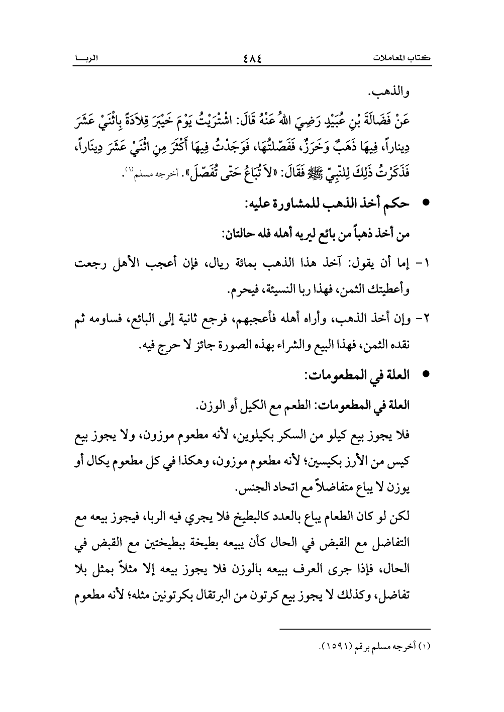 عَنْ فَضَالَةَ بْنِ عُبَيْدٍ رَضِيَ اللهُ عَنْهُ قَالَ: اشْتْرَيْتُ يَوْمَ خَيْبَرَ قِلاَدَةً بِاثْنَيْ عَشَرَ دِيناراً، فِيهَا ذَهَبٌ وَخَرَزٌ، فَفَصّلتُهَا، فَوَجَدْتُ فِيهَا أَكْثَرَ مِنِ اثْنَيْ عَشَرَ دِينَاراً، فَذَكَرْتُ ذَلِكَ لِلنّبِيّ - صلى الله عليه وسلم - فَقَالَ: «لاَ تُبَاعُ حَتّى تُفَصّلَ». أخرجه مسلم (¬1).