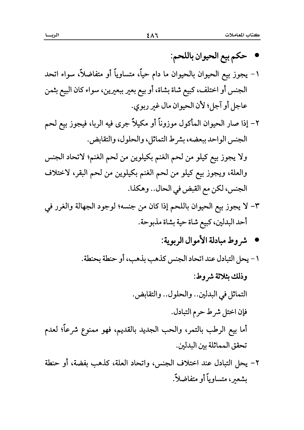 3 - لا يجوز بيع الحيوان باللحم إذا كان من جنسه؛ لوجود الجهالة والغرر في أحد البدلين، كبيع شاة حية بشاة مذبوحة.